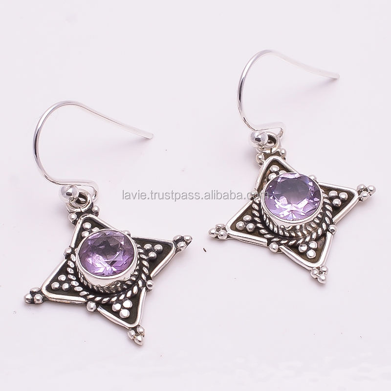 Boucles d'oreilles en argent massif 925 Exportateur de bijoux en argent fin Améthyste personnalisée Suppiler de bijoux en pierres précieuses