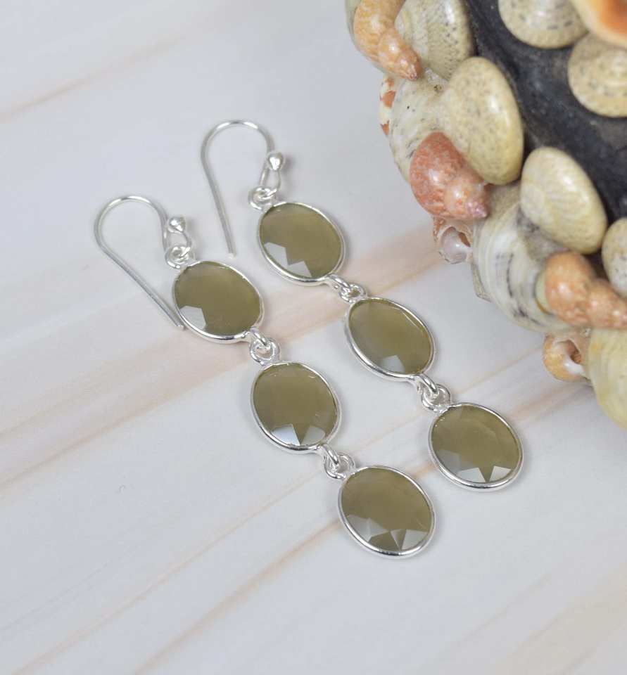 Solide 925 Sterling Silver Trois Pierre Ovale Brillant Coupe Boucles D'oreilles À La Main Gris Calcédoine Bijoux pour La Fête De Mariage Pâques