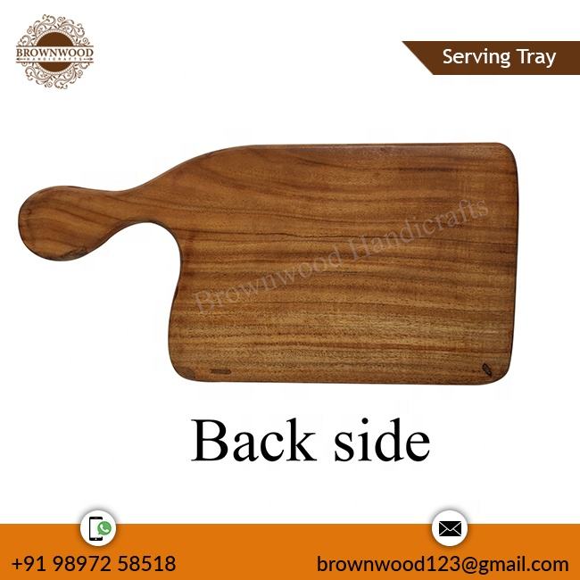 Assiette de service en bois d'acacia massif faite à la main avec poignée pour servir les aliments Assiette en bois au design personnalisé Nouvelle arrivée