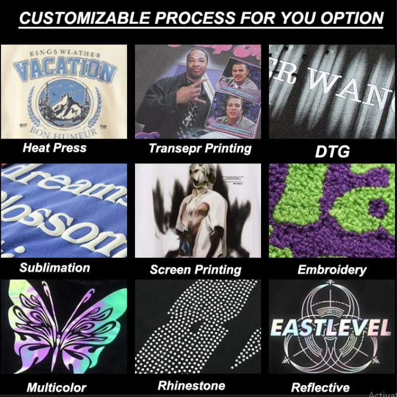 Méthodes d'impression:Tie-dye, Impression Puff, EMBOSSÉ, Impression à transfert de chaleur par injection directe de vêtements prêts à l'emploi, Impression numérique directe de vêtements prêts à l'emploi