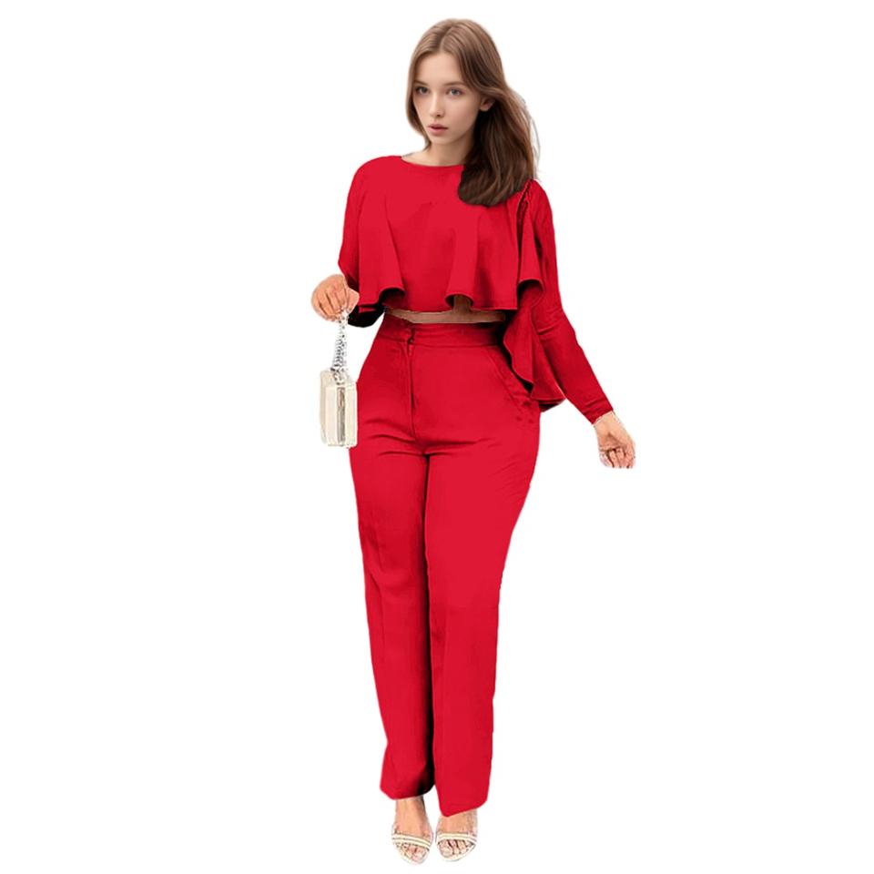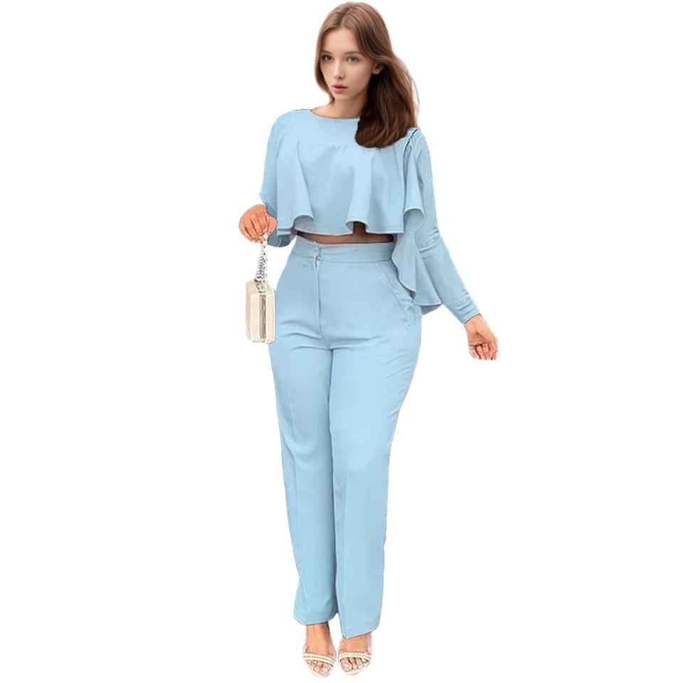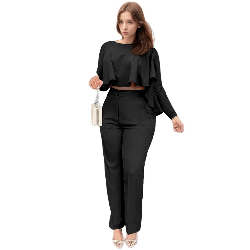 Ensemble deux pièces pour femmes, pantalon droit asymétrique à volants de couleur unie, tenue tendance