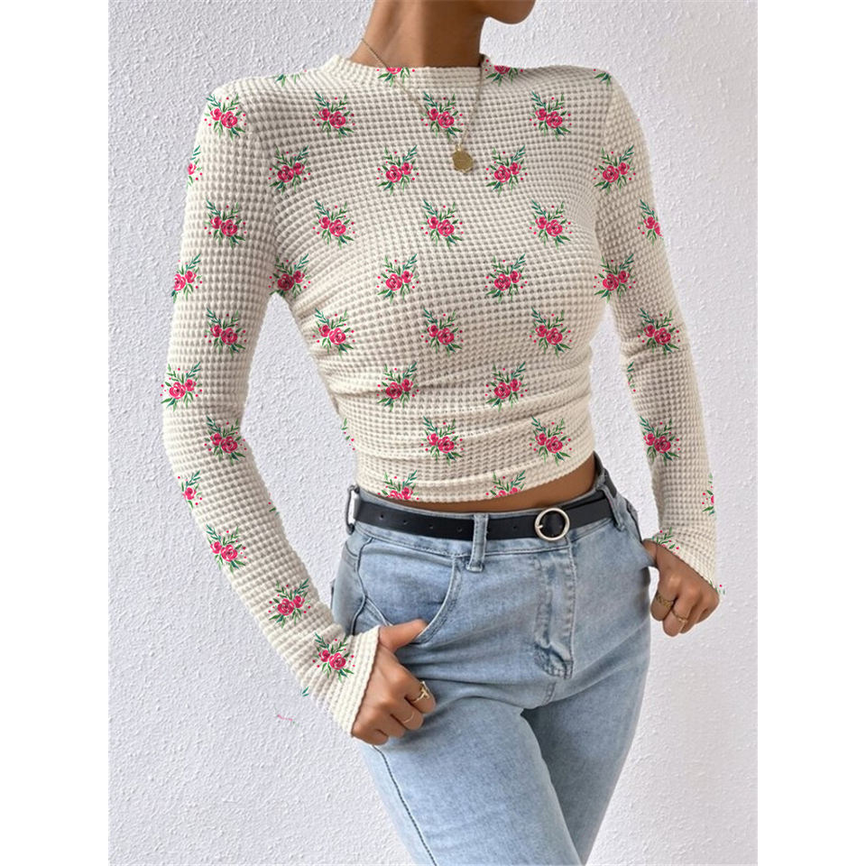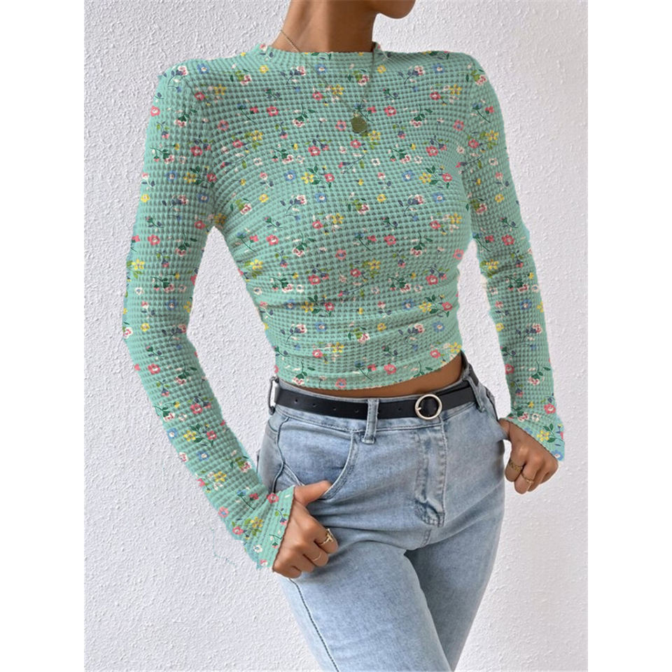 T-shirt femme à manches longues, col rond, coupe slim, couleur unie, à carreaux, avec cordon de serrage, tendance