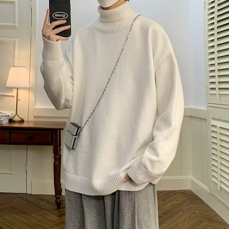 Pull en tricot de couleur unie à col haut pour garçon polyvalent chaud intérieur automne hiver Plaid à la mode pull à fond ample ligne de printemps