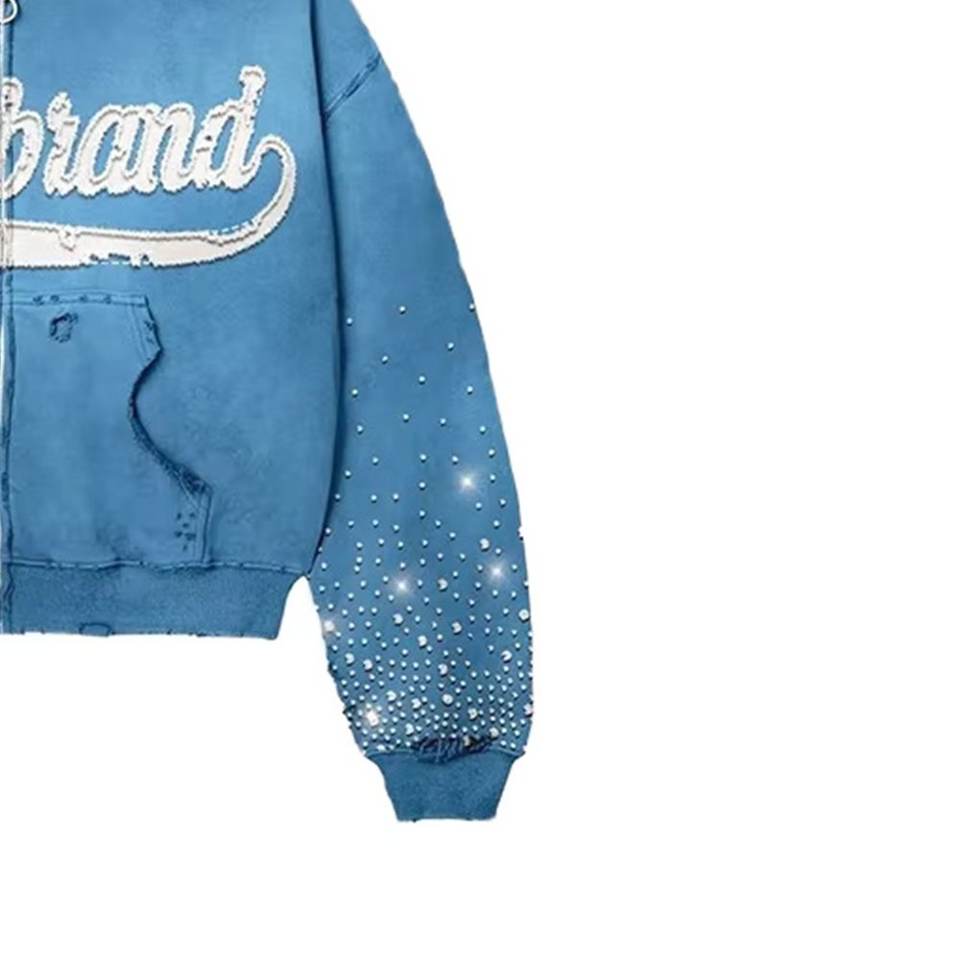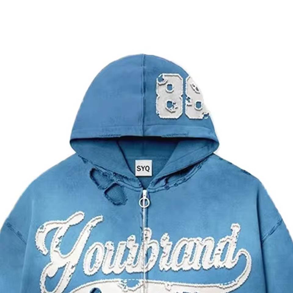 Sweat à capuche zippé brodé de logo personnalisé solide à la mode Streetwear en détresse délavé à l'acide coupe Boxy 100% coton sweat-shirt