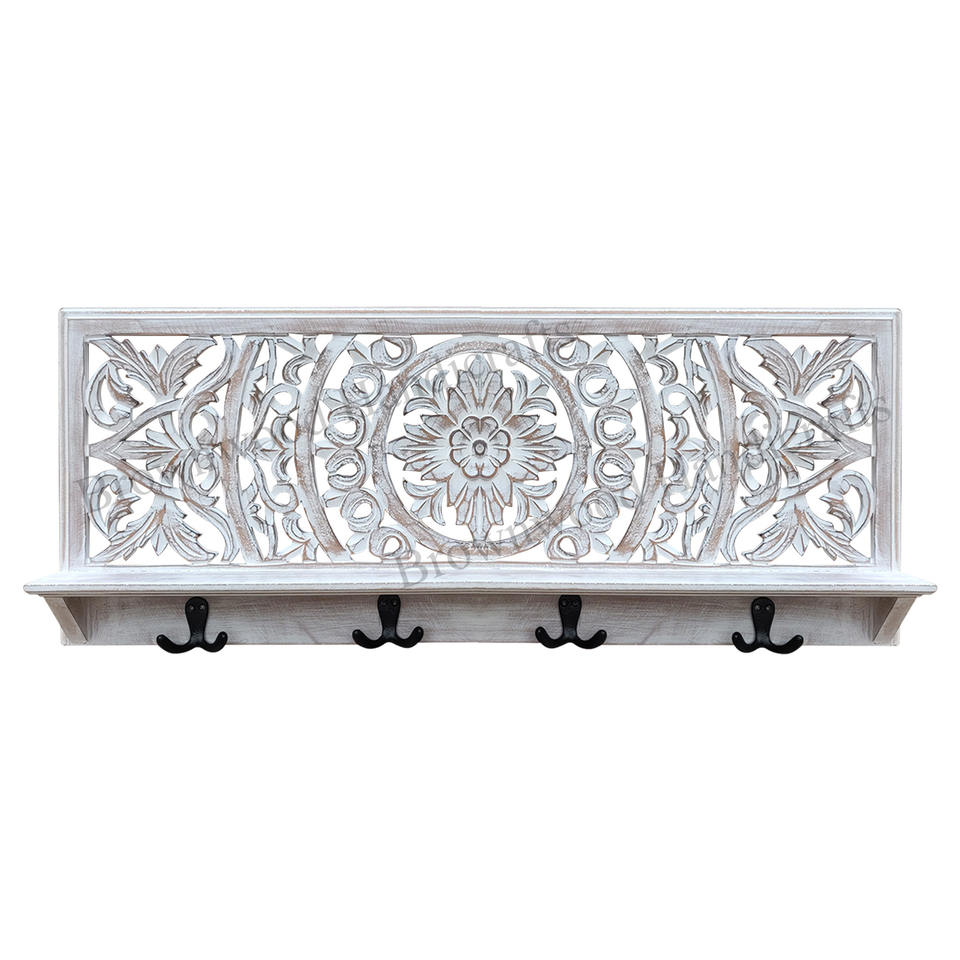 Crochet mural en bois de manguier massif pour vêtements clés décoration de luxe conceptions personnalisées crochets de montage mural blanc délavé pas cher prix motif fleur