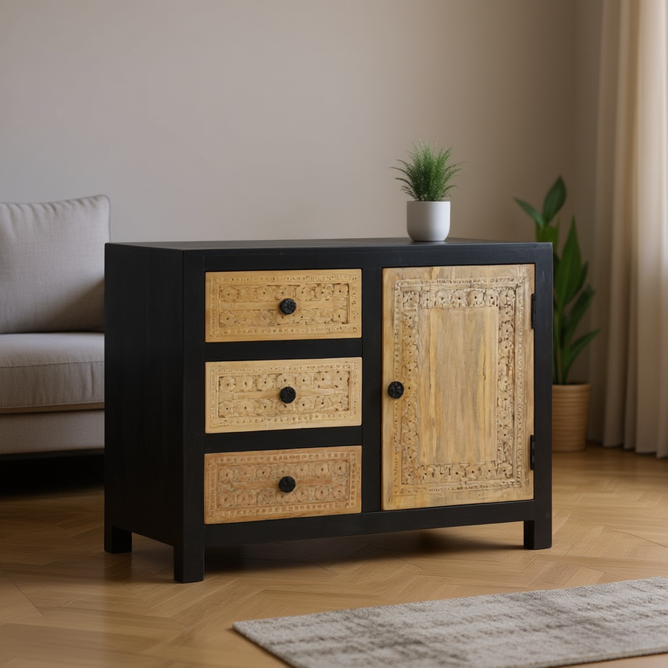 Armoire latérale en bois de manguier massif avec 3 tiroirs et 1 porte, meuble de rangement rustique pour salon