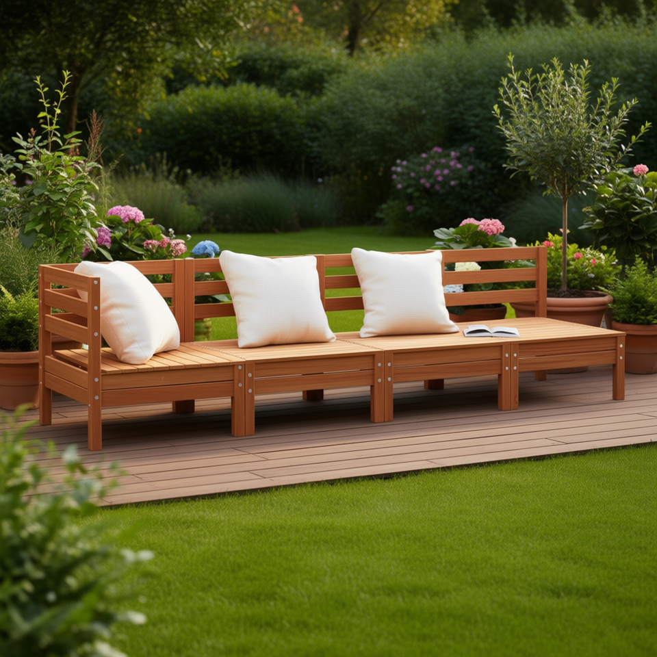 Canapé de jardin modulaire quatre places en bois de pin massif, ensemble de meubles d'extérieur, brun ciré