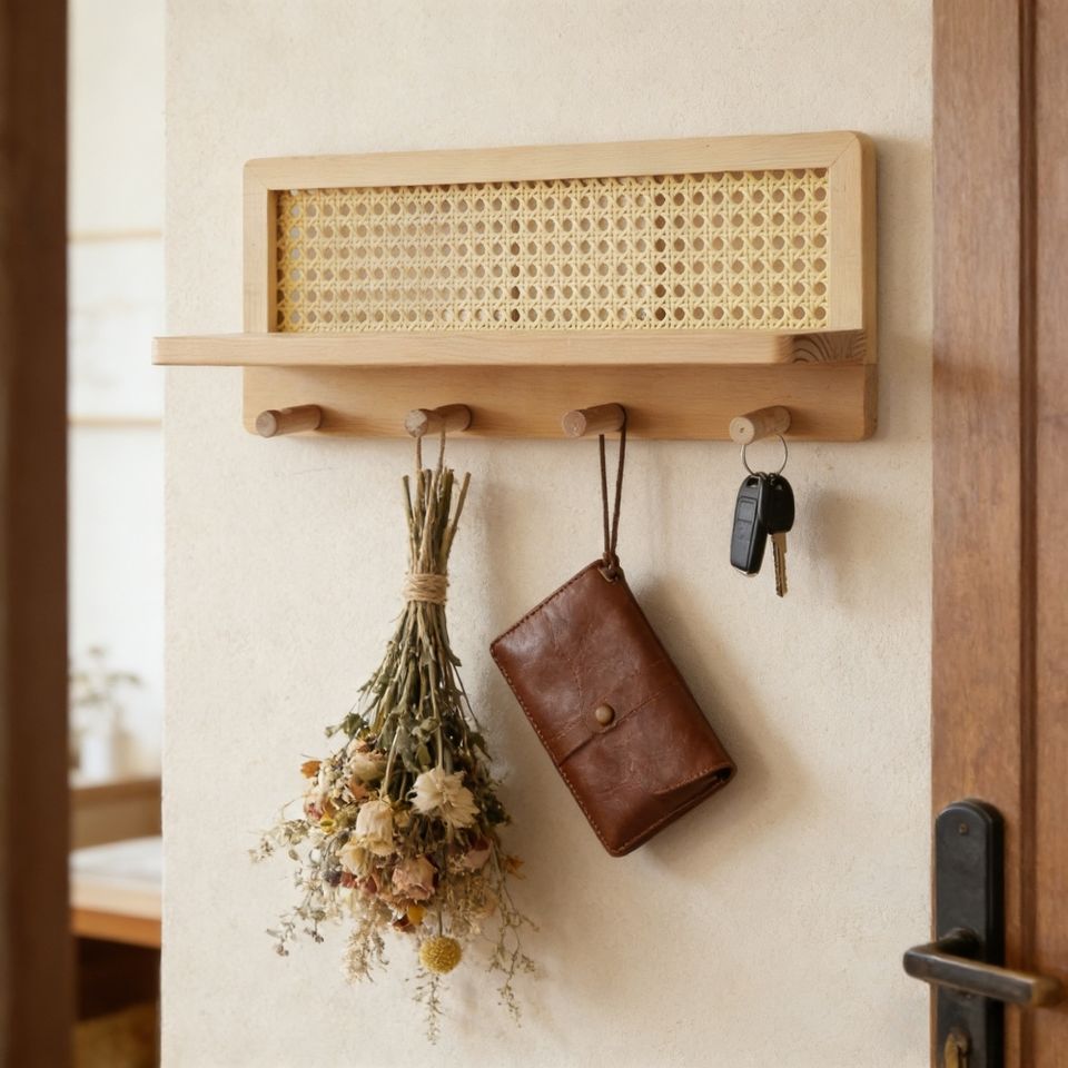 Étagère murale Art Déco en rotin et bois de pin massif avec crochets, porte-clés et porte-manteau tressé créatif, organisateur pour salle de bain et entrée, décoration intérieure