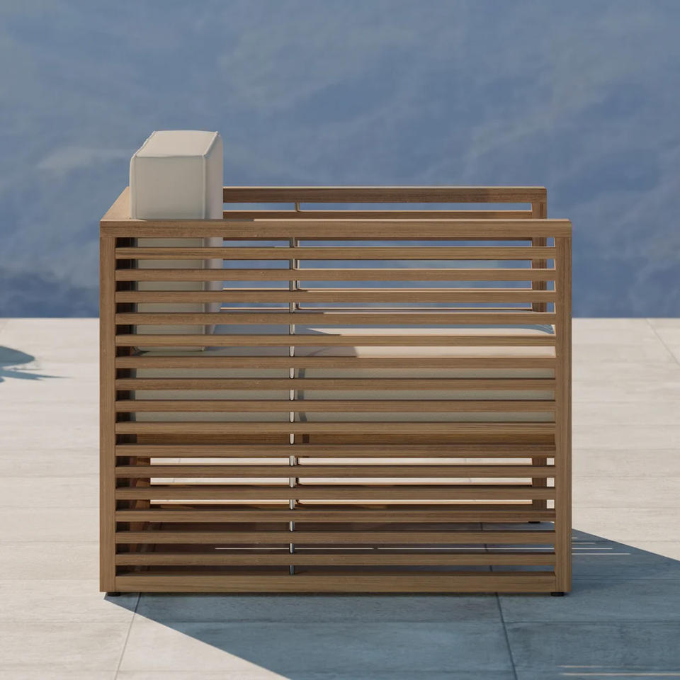 Ensemble de canapés en teck massif pour intérieur et extérieur, couleur naturelle, avec coussins résistants au soleil, pour utilisation en jardin.
