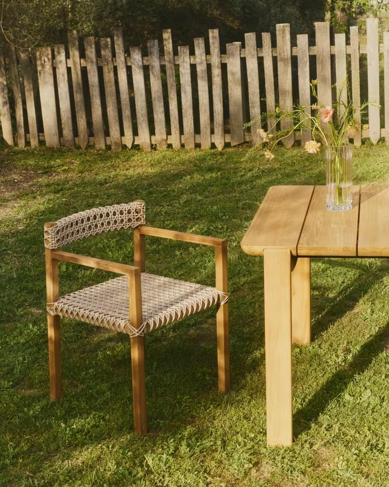 Chaise de salle à manger en teck massif écologique avec dossier et assise en corde naturelle tressée pour un mobilier moderne, rustique ou d'appartement
