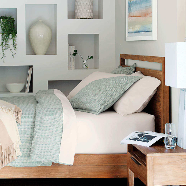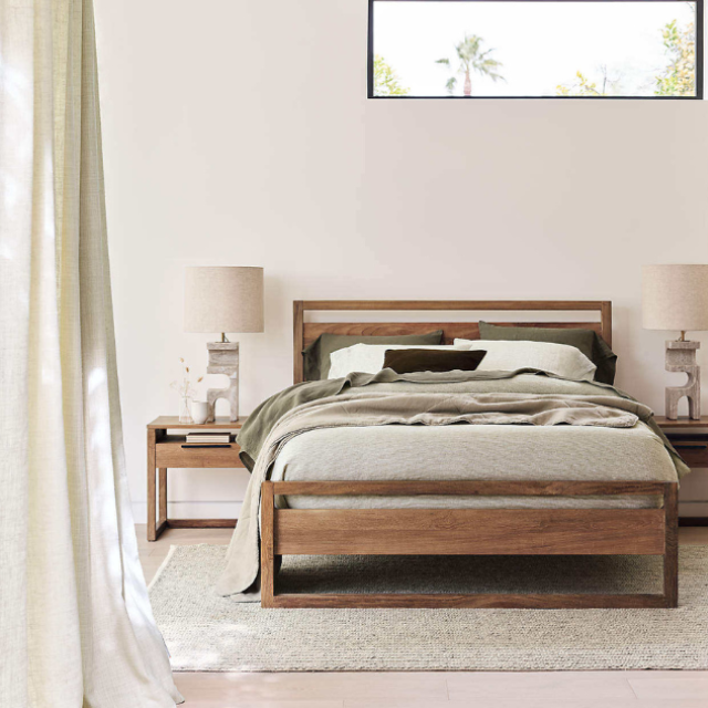 Cadre de lit double en teck massif avec finition naturelle et design minimaliste pour la décoration de chambre à coucher
