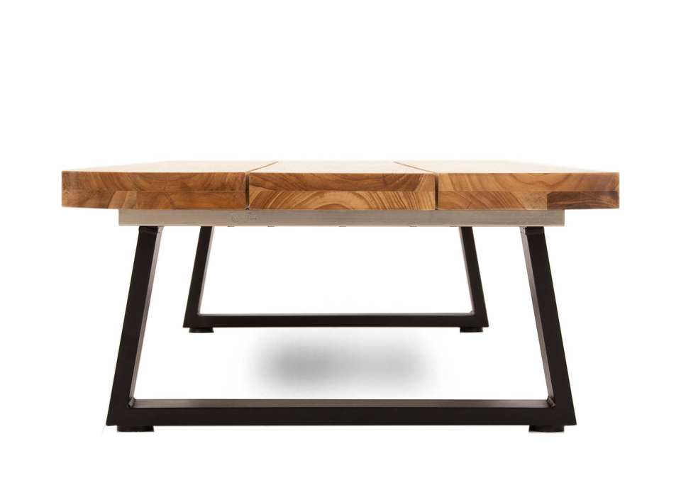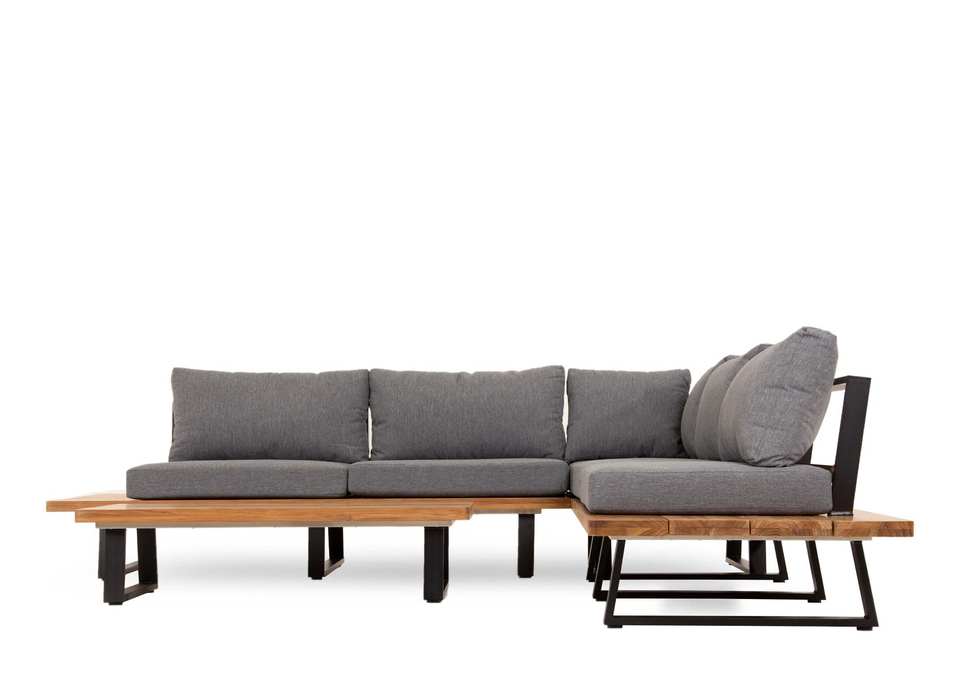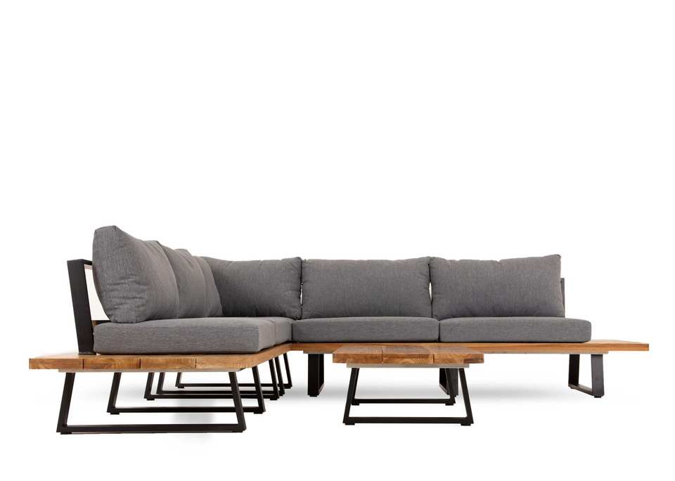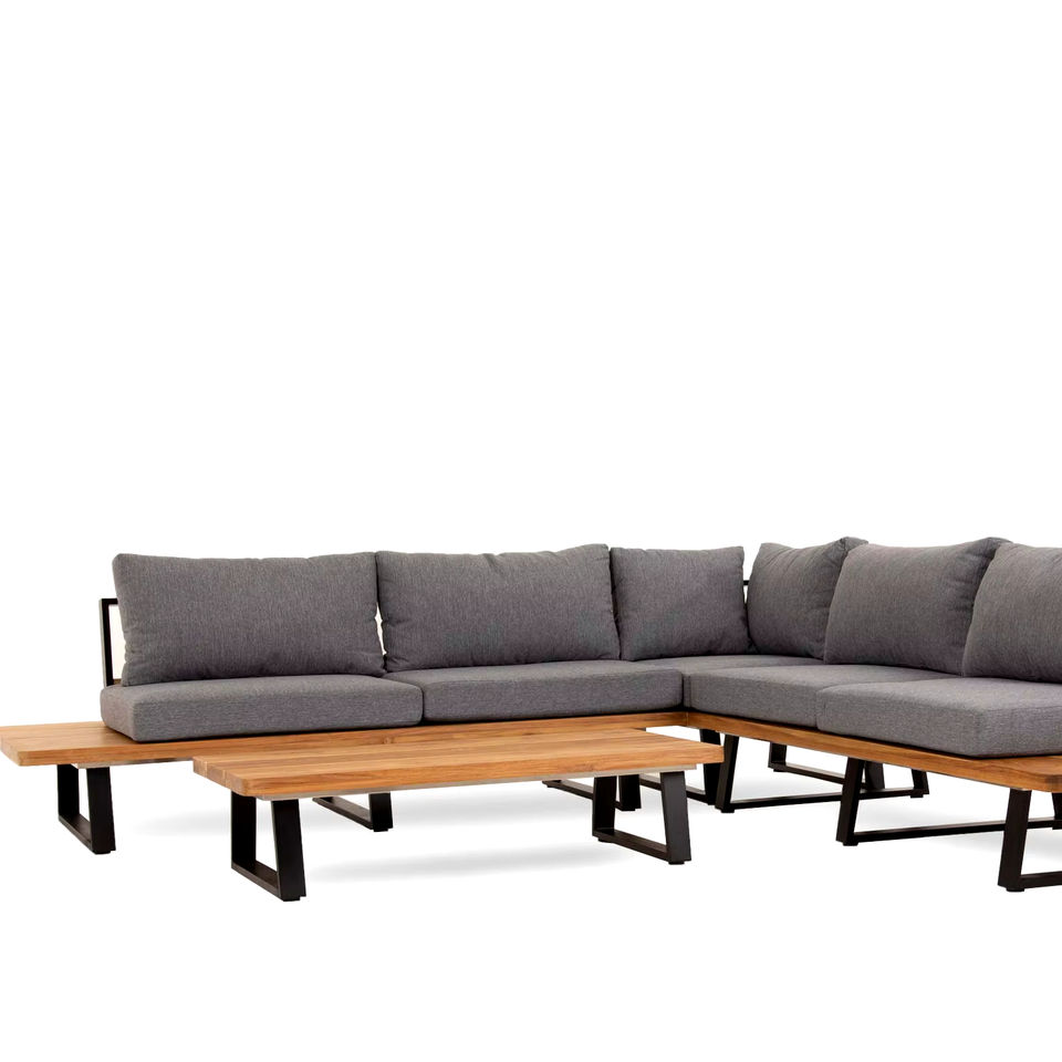 Ensemble de canapés d'angle modernes en bois de teck massif, finition couleur naturelle, pieds en fer, coussins résistants au soleil, pour salon extérieur, cour