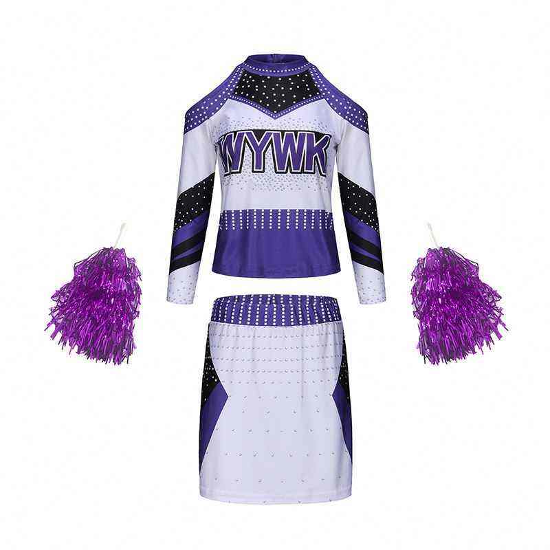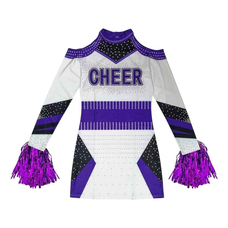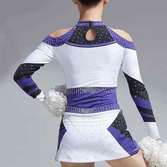 Uniforme de cheerleading 100% coton, coupe athlétique, manches longues, passepoil contrastant, ornements en pierres scintillantes et pompons en strass, modèle Solid Traders
