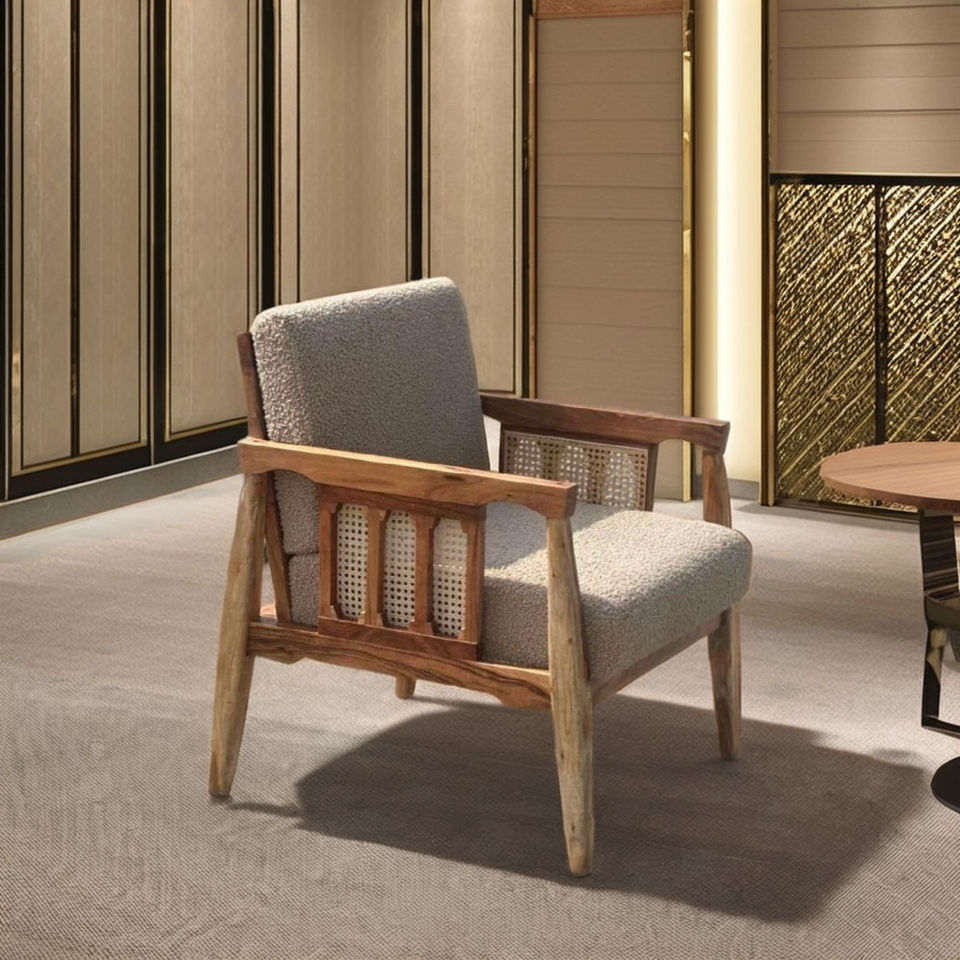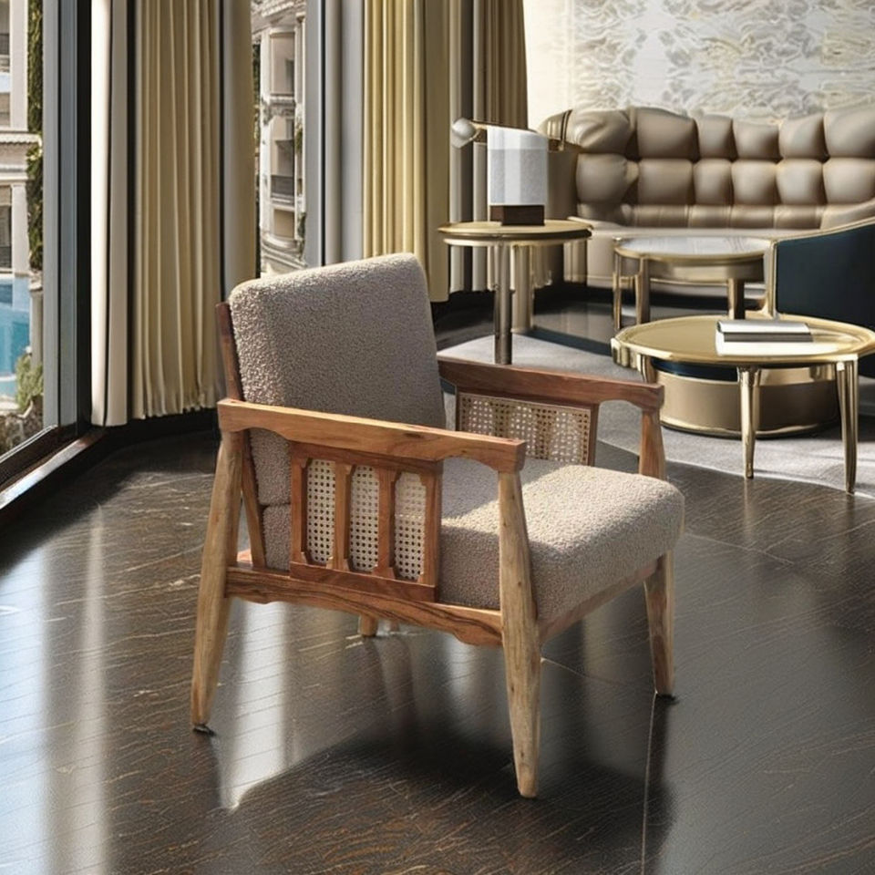 Fauteuil en bois massif avec travail en osier et coussin, design moderne, construction durable, usage commercial