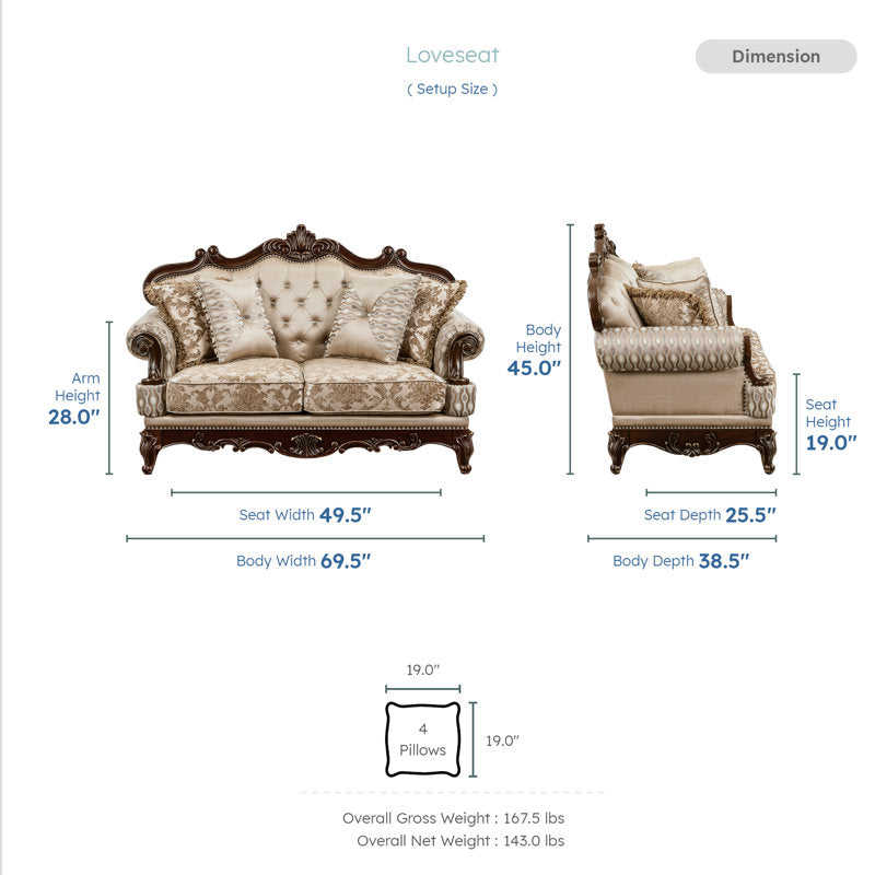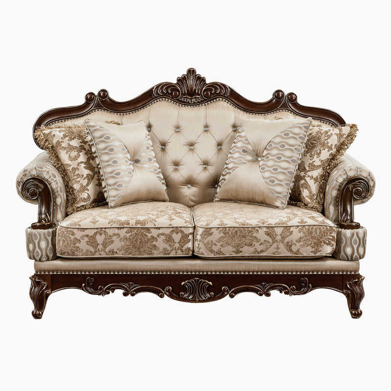 Canapé à cadre sculpté en bois massif avec sièges en tissu damassé et coussin de dossier capitonné pour les intérieurs de salon contemporains Regal