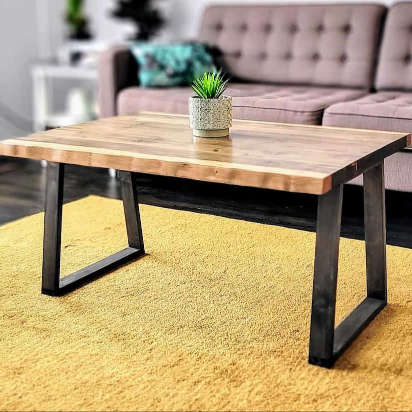Table basse en bois massif finition naturelle avec pieds en métal, meuble élégant pour la décoration moderne du salon
