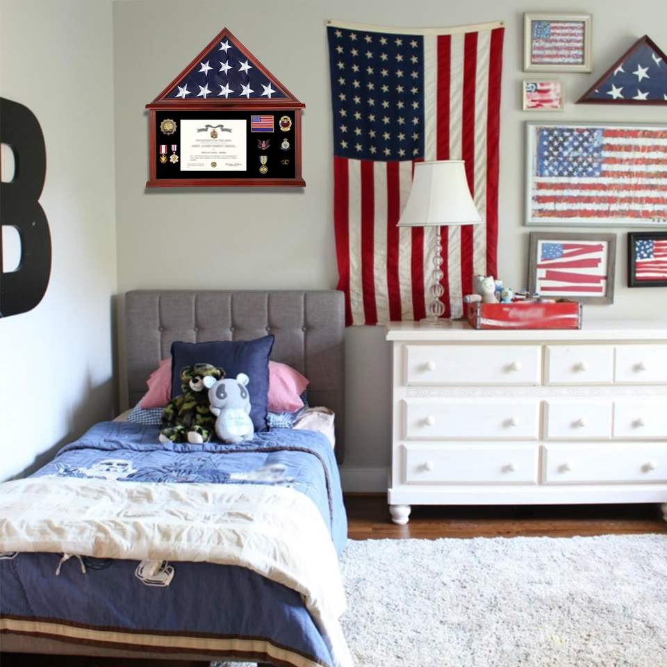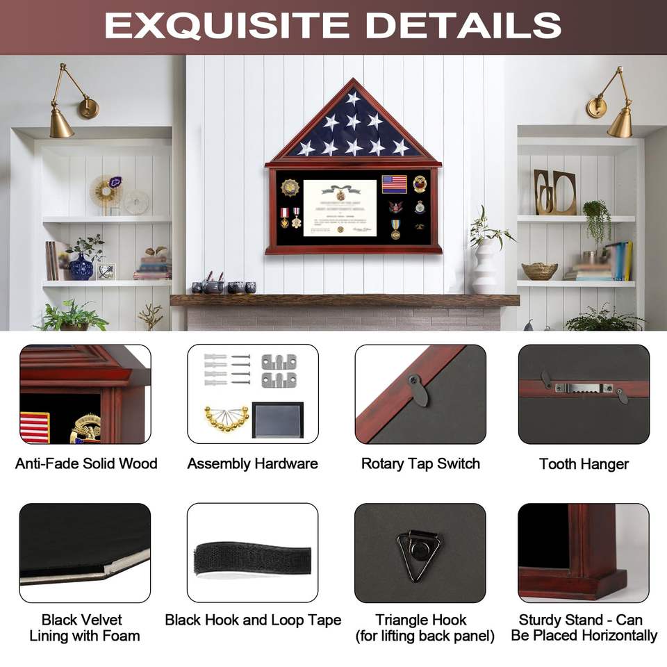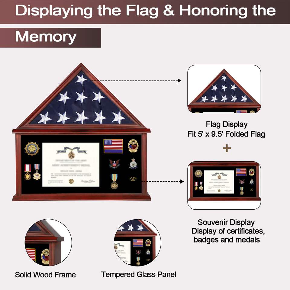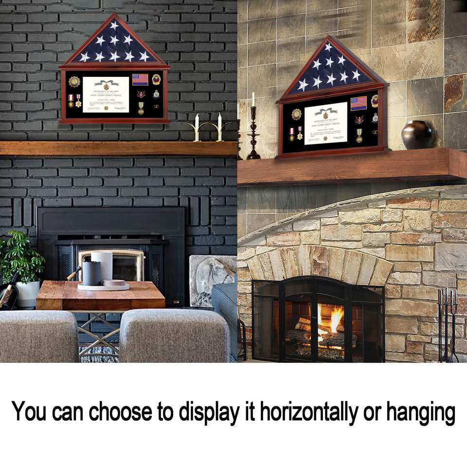 Vitrine en bois massif avec verre trempé - Boîte à drapeau en acajou pour drapeau plié de 5'x9.5' et support pour certificat