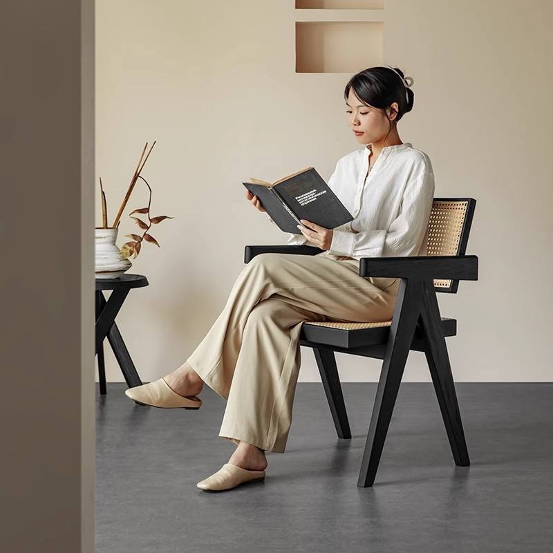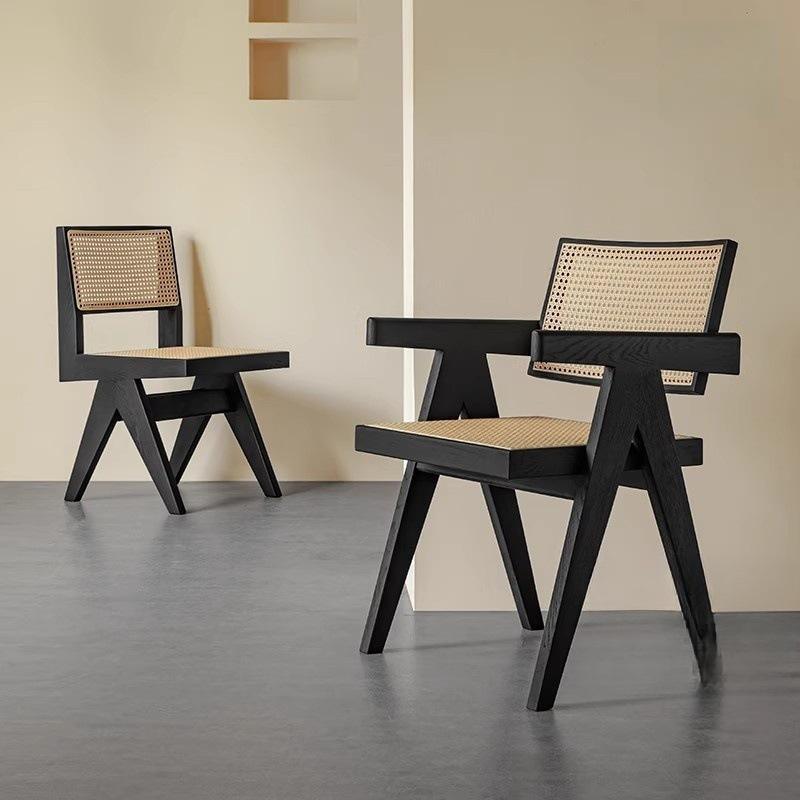 Chaise de salle à manger en rotin et bois massif avec dossier et accoudoirs, chaise de loisirs noire en forme de K pour usage domestique