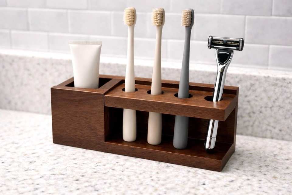 Support de brosse à dents en bois massif pour le rangement des accessoires de salle de bain avec organisateur de dentifrice à plusieurs compartiments