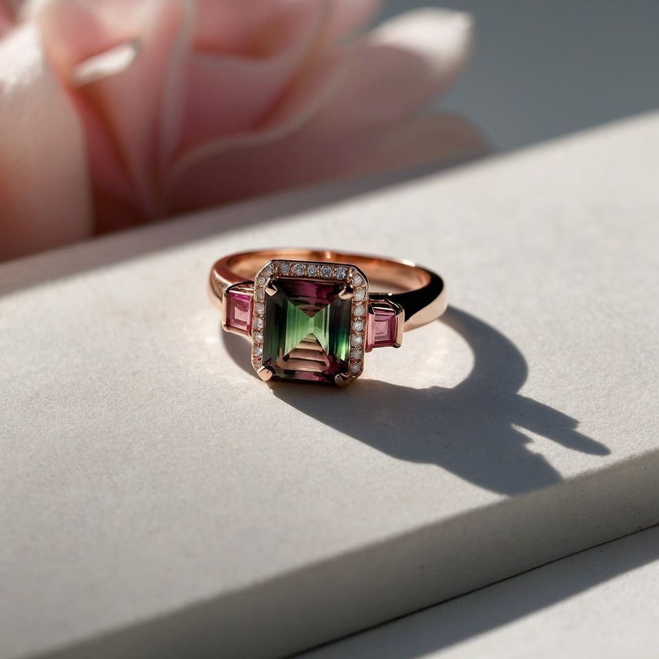 Bague artisanale à trois pierres en tourmaline bicolore en or jaune massif, bijoux fins d'inspiration vintage personnalisés, design unique