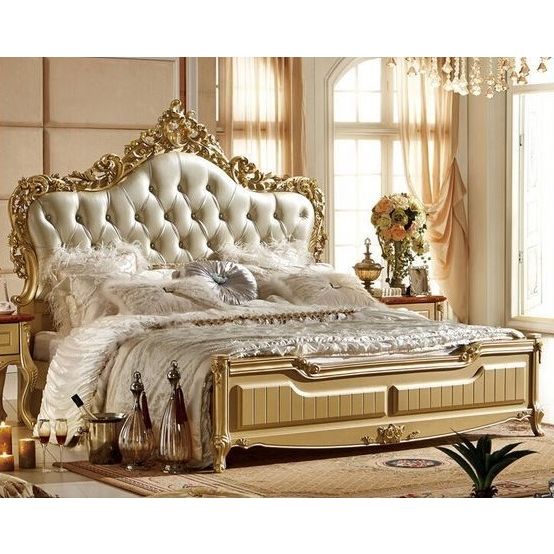 Lit King en bois massif cadre doré avec tête de lit rembourrée sculptée-meubles en bois antique fabrication artisanale de Jepara