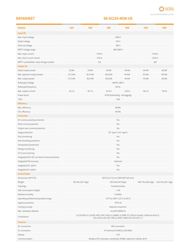 Convertisseur triphasé Solis S6-GC(25-60)K-US, sortie 480V, efficacité 98,8%, WiFi, surveillance à distance 4G, protection contre les surtensions de type II, NEC