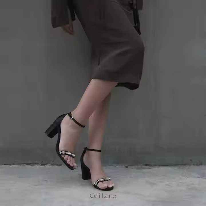Description du produit:Tissu satiné-orné de lanières pierre-talon de 9 cm