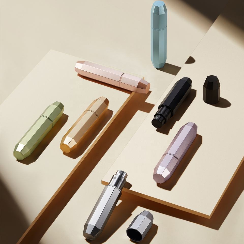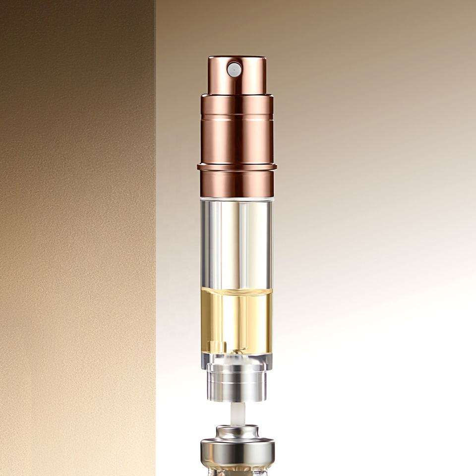 Flacon de parfum rechargeable haut de gamme en aluminium et PCTG, à remplissage par le bas, avec pompe intégrée, directement de l'usine pour l'export.
