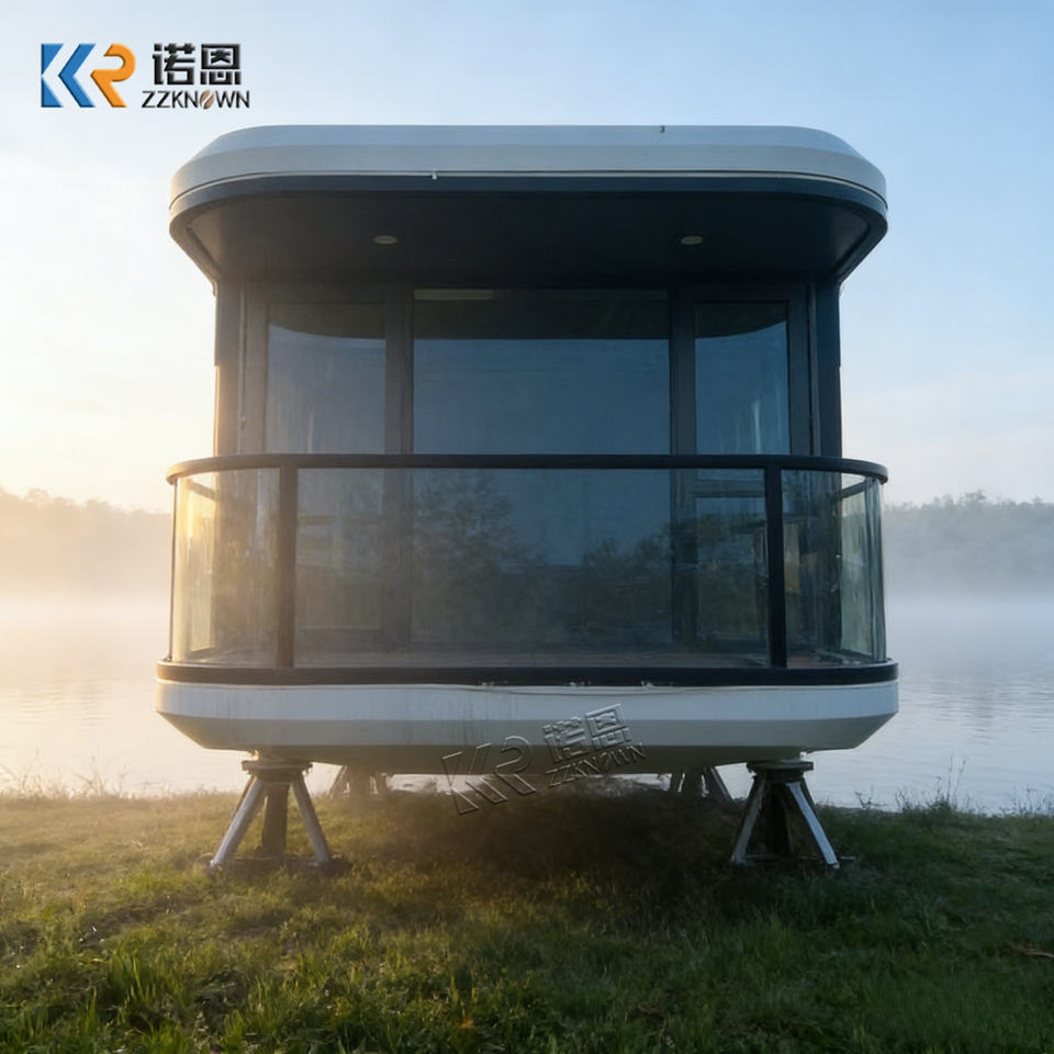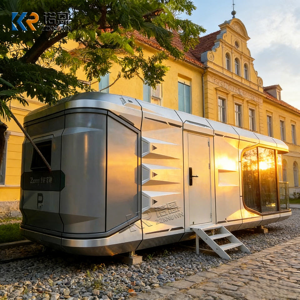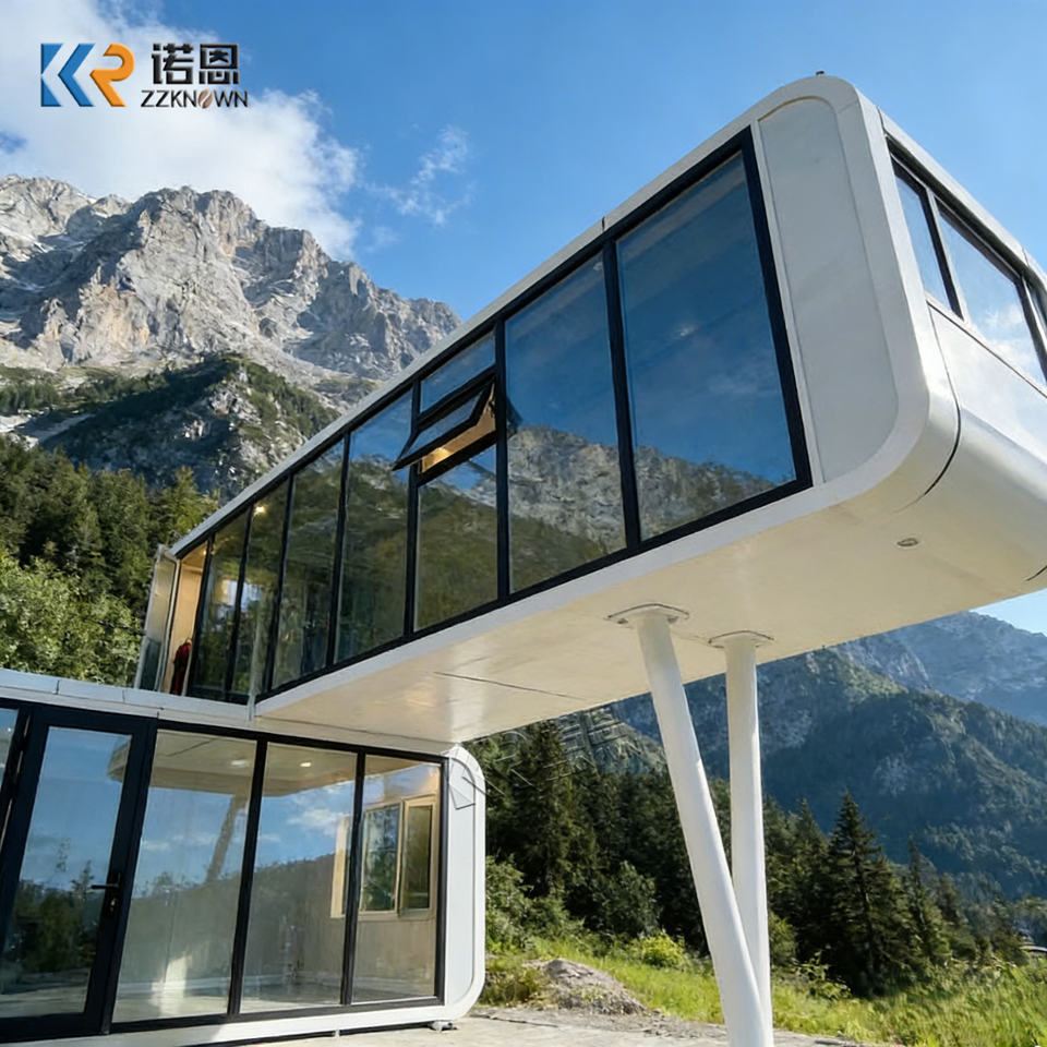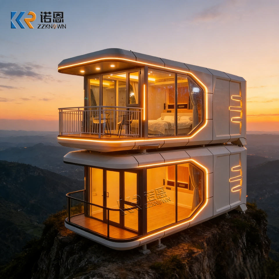 Capsule spatiale commerciale, maison conteneur avec salon et cuisine, hôtel, design de capsule spatiale démontable