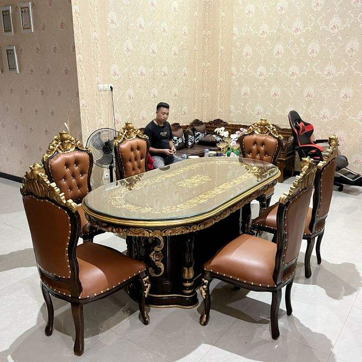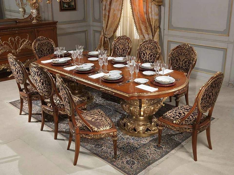 Ensemble table et chaises de salle à manger de luxe en bois spacieux, conçu pour les familles nombreuses, offrant confort, beauté et durabilité
