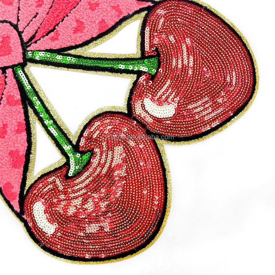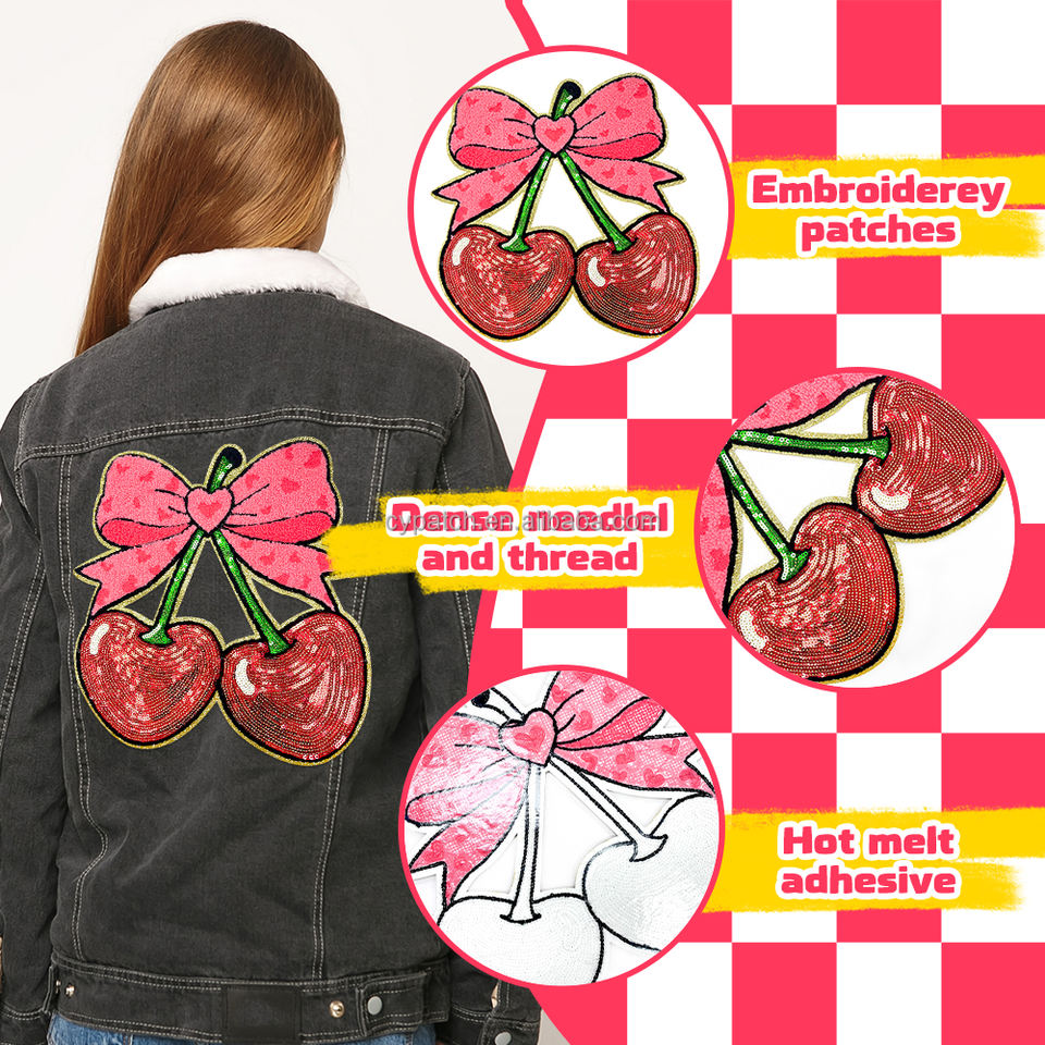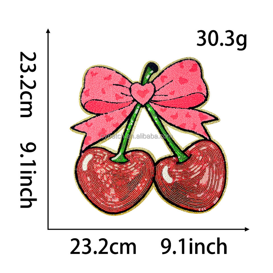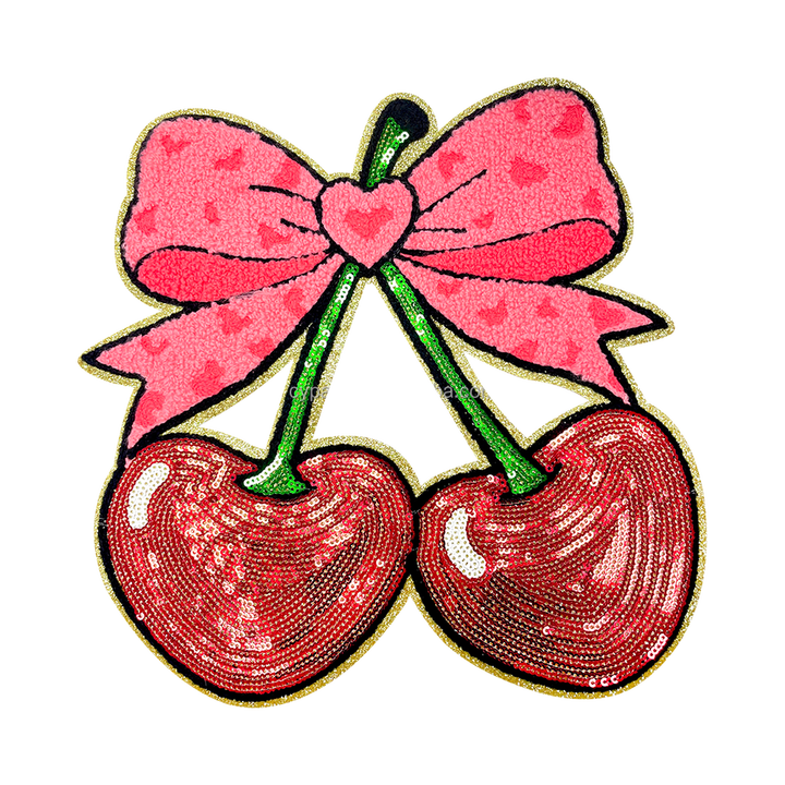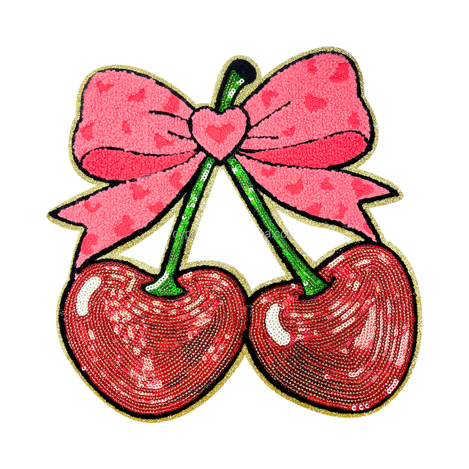 Design scintillant de cerises et de nœuds avec des détails en paillettes, parfait pour personnaliser les projets de mode et ajouter une touche amusante