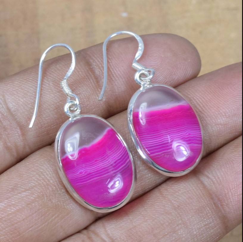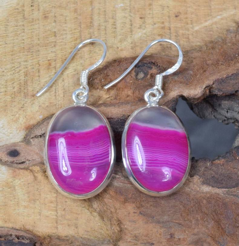 Product Name:Natural Pink Banded Agate Gemstone Silver Earrings