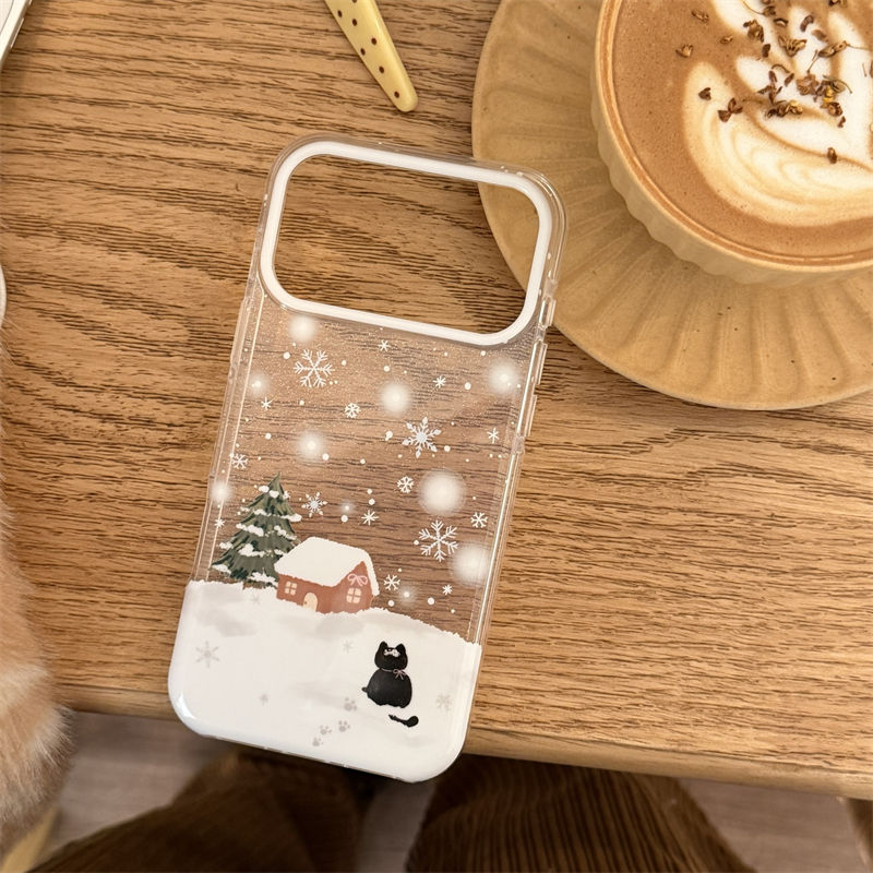 Coque de téléphone chat noir avec flocons de neige et paillettes pour iPhone 17, 16 Pro Max, 15 Pro, 14 Max, 13 – Protection antichute élégante