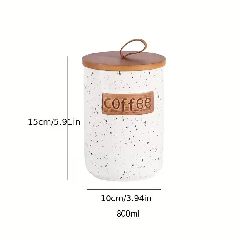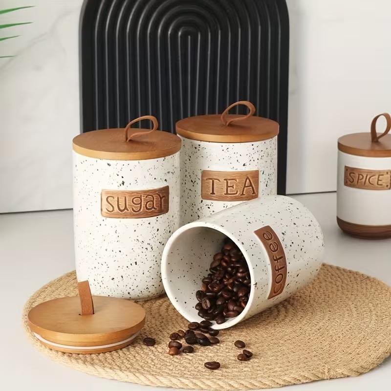 Ensemble de pots de rangement de cuisine à finition mouchetée avec couvercle en bois et étiquette en relief, organisateur de comptoir moderne pour thé, café et sucre