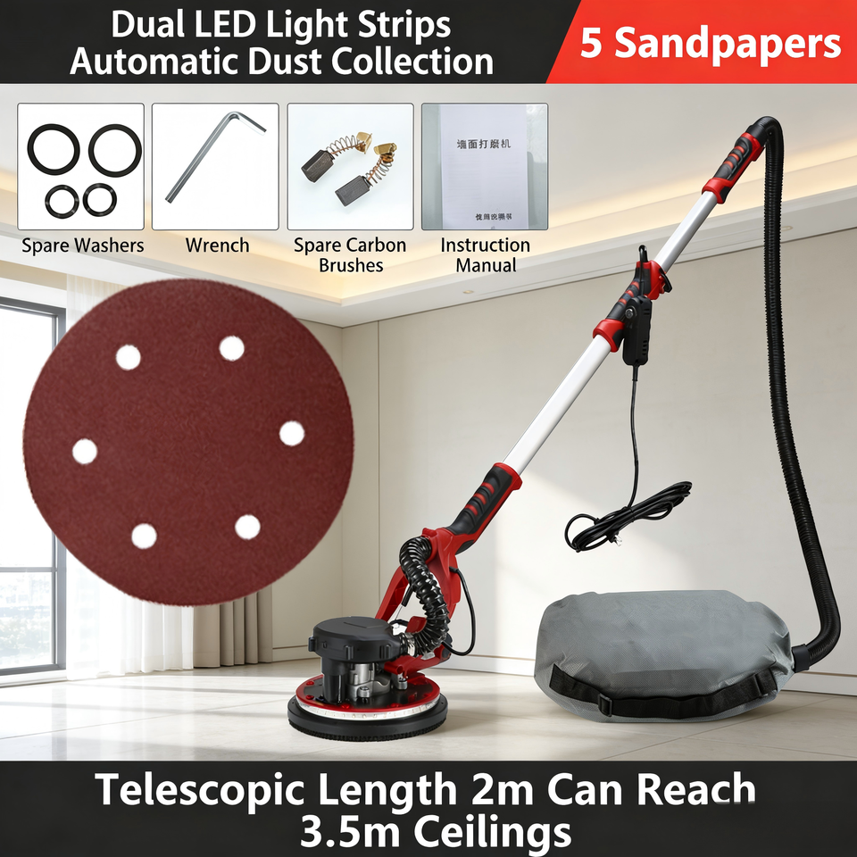 Ponceuse électrique à long manche à vitesse variable avec LED et aspiration intégrée pour plafonds et cloisons sèches, idéale pour le bricolage
