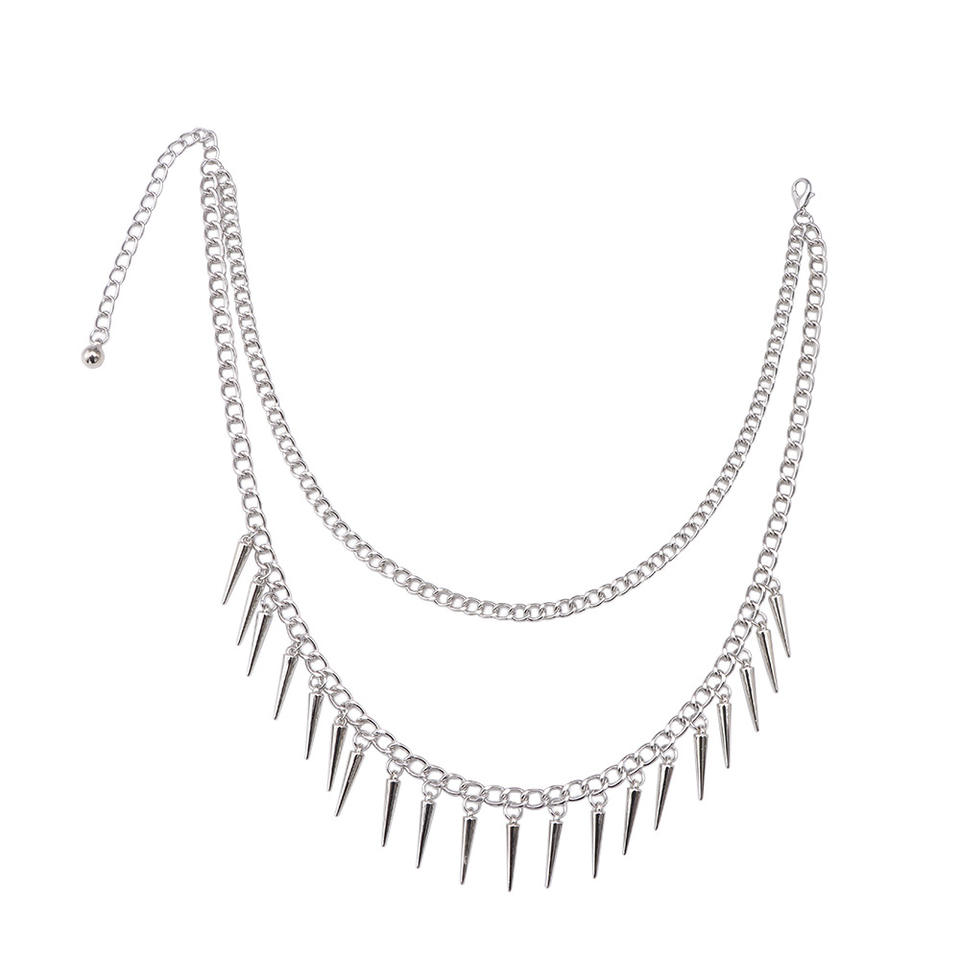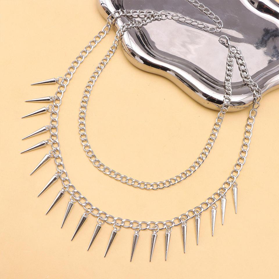 Collier chaîne à pointes argenté double couche style punk avec rivets coniques, ras-de-cou tendance pour soirée, bijoux hip-hop pour femmes et hommes