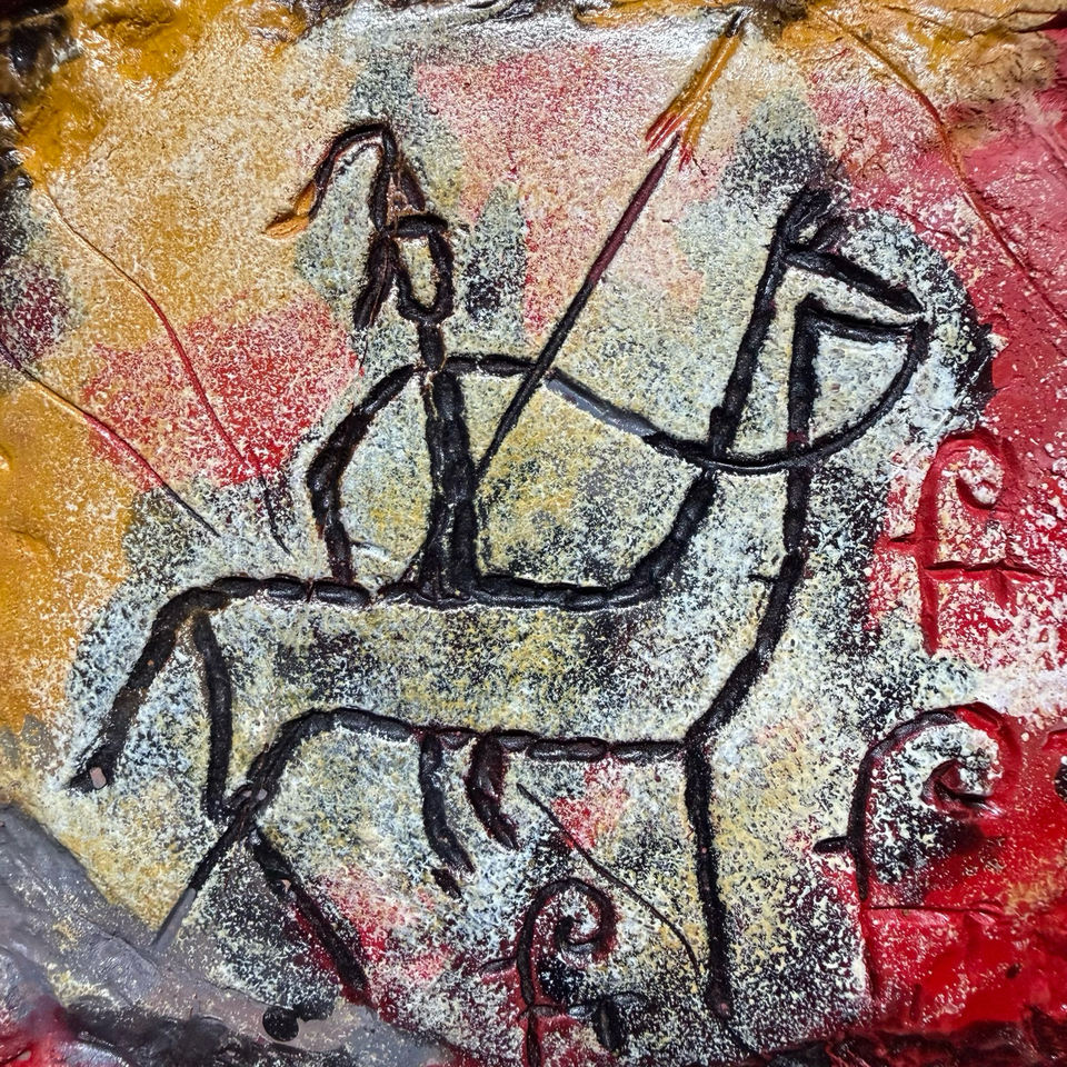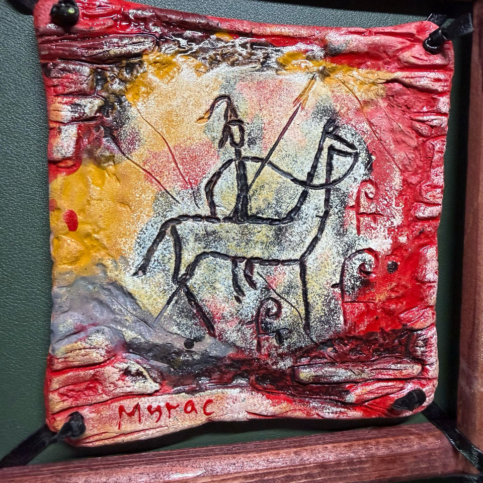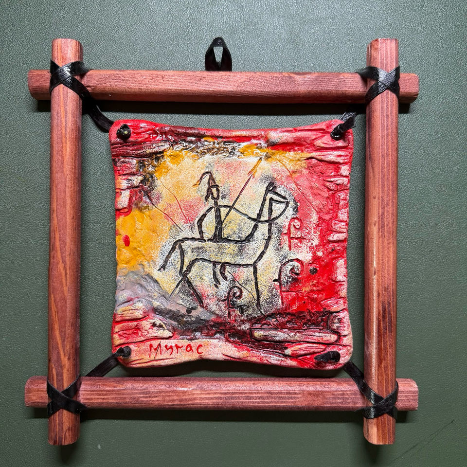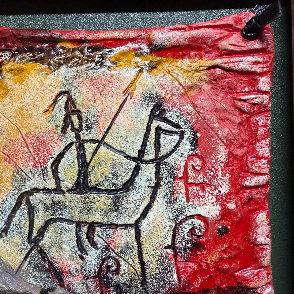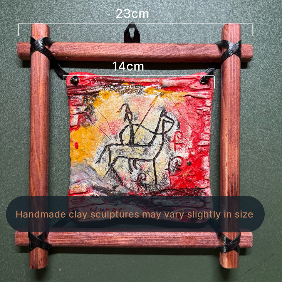 Pendentif Petroglyph Spirit Drover fait main avec cadre en bois, Talisman de la Voie de la Soie Ancienne pour la Manifestation et la Purification.