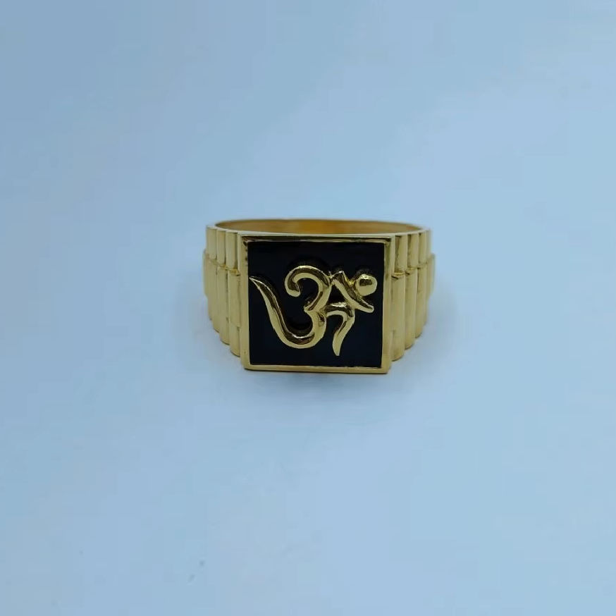 Bague Chevalière Om Spirituelle en Or 22K, Symbole Religieux, Incrustation Émail Noir, Bijou Hindou en Or Pur, Bague Dévotionnelle pour Homme, Vente en Gros