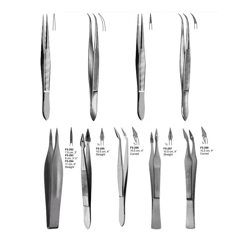 Pinces Splinter 8 cm (3 pouces) droites et courbes, pinces Feilchenfeld droites 11 cm (4 pouces), pinces Hunter 10,5 cm (4 pouces)