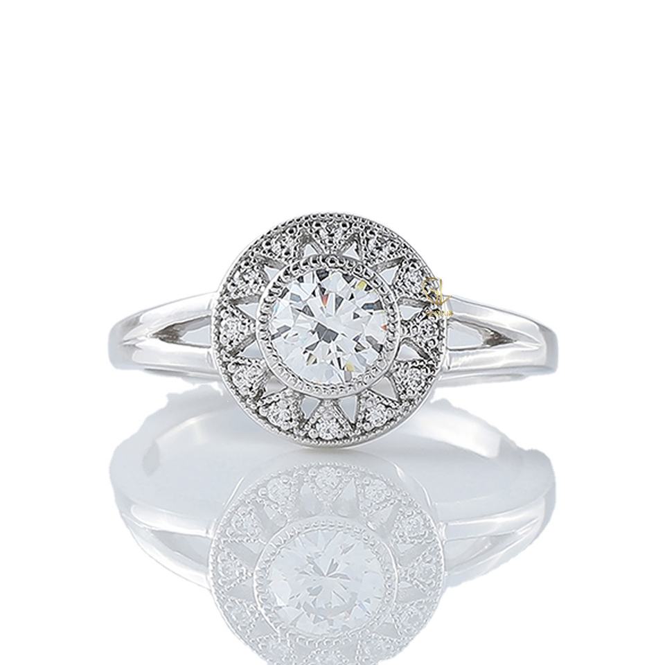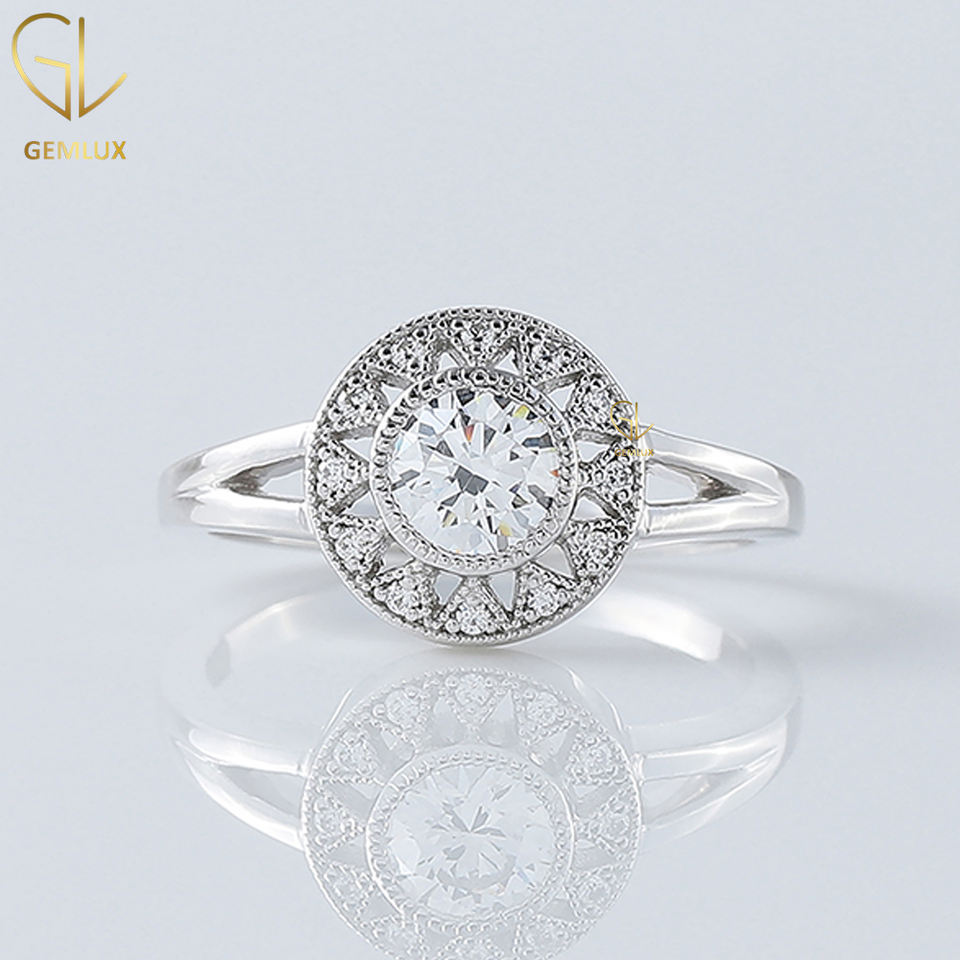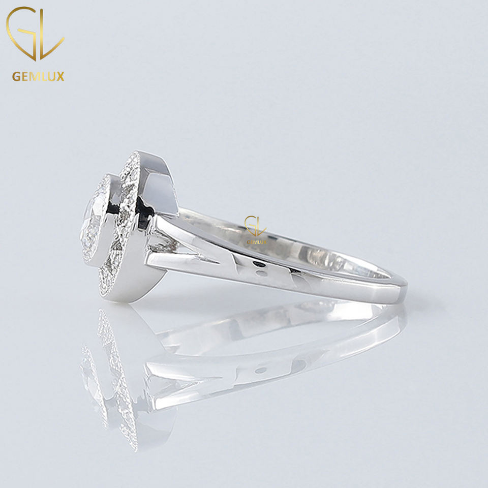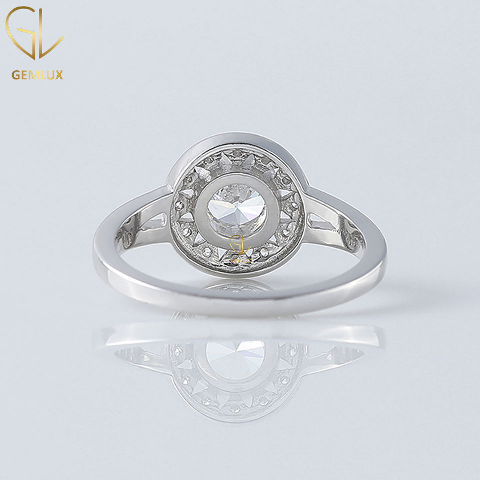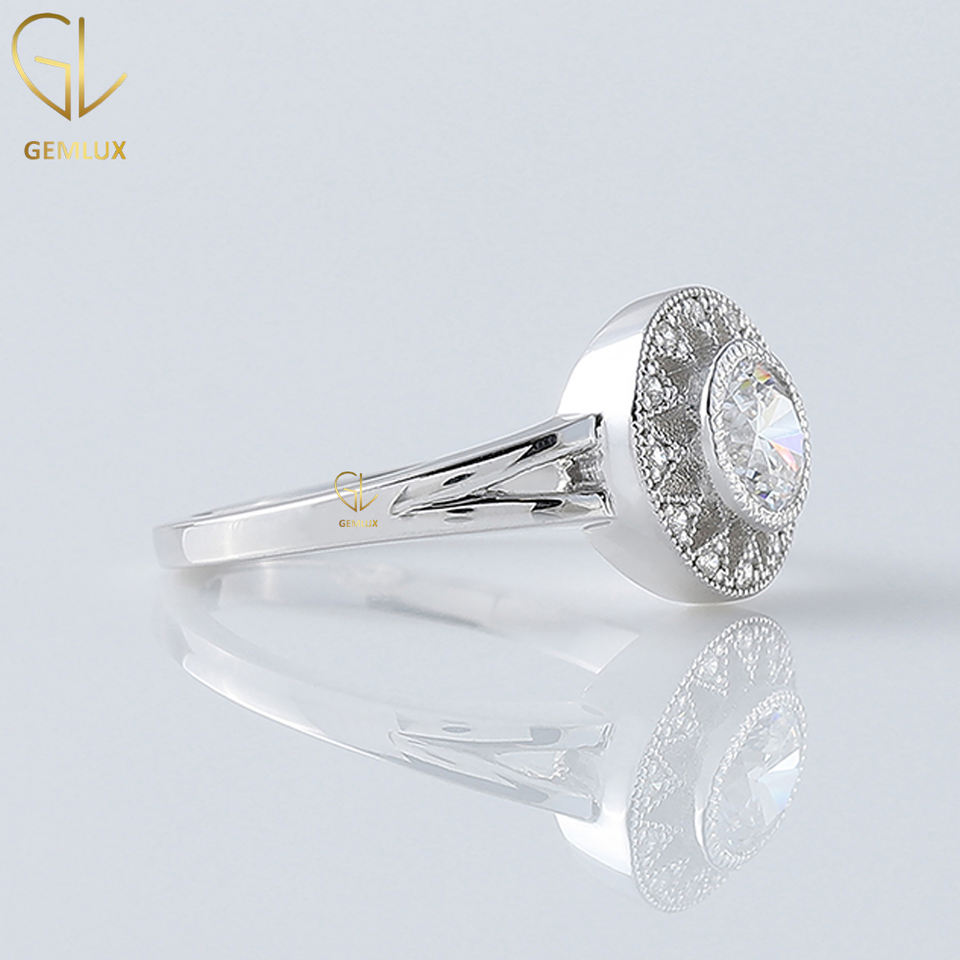 Bague en diamant Moissanite à tige fendue, bague de fiançailles Halo floral Moissanite coupe ronde de 2.5 ct, bague de mariage Milgrain ensemble lunette