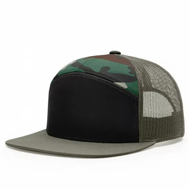 Casquette de sport Logo Matériau de qualité Casquette de camionneur unisexe réglable à 7 panneaux avec impression en maille contrastée de couleur personnalisée Vente en gros