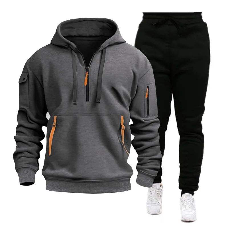 Ensemble de survêtement pour homme, sweat-shirt à capuche zippé uni, pantalon de survêtement multi-poches, 100% coton respirant