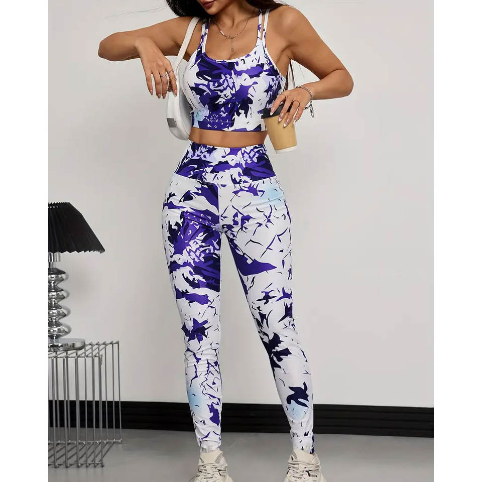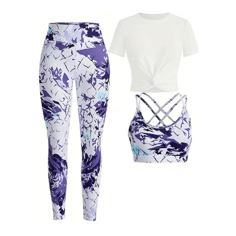 Ensemble trois pièces de sport T-shirt et pantalon de sport de yoga, ensemble de couverture semi-transparent à motif géométrique de couleur unie