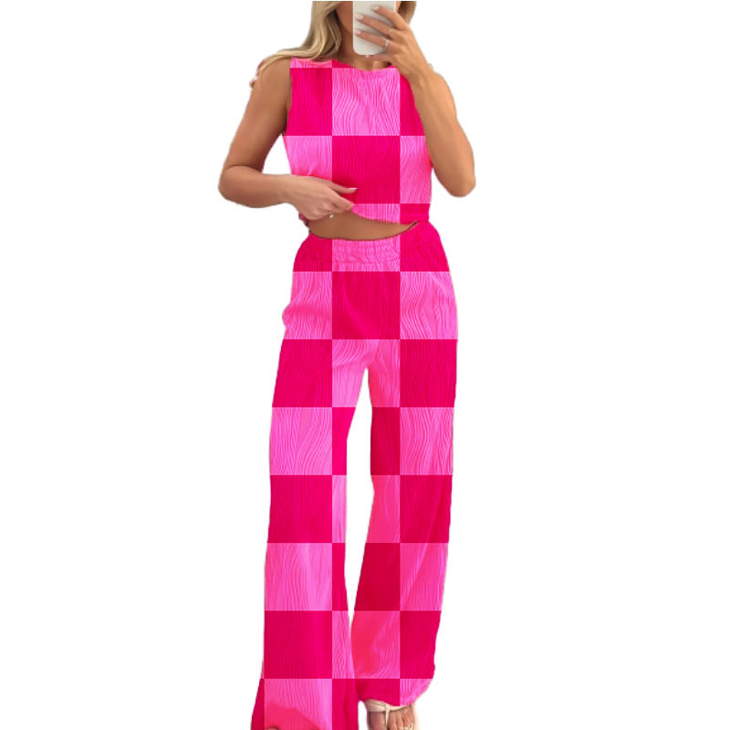 Ensemble deux pièces décontracté pour femme, pantalon droit ample à col rond et motif vague d'eau, couleur unie, en stock, tendance