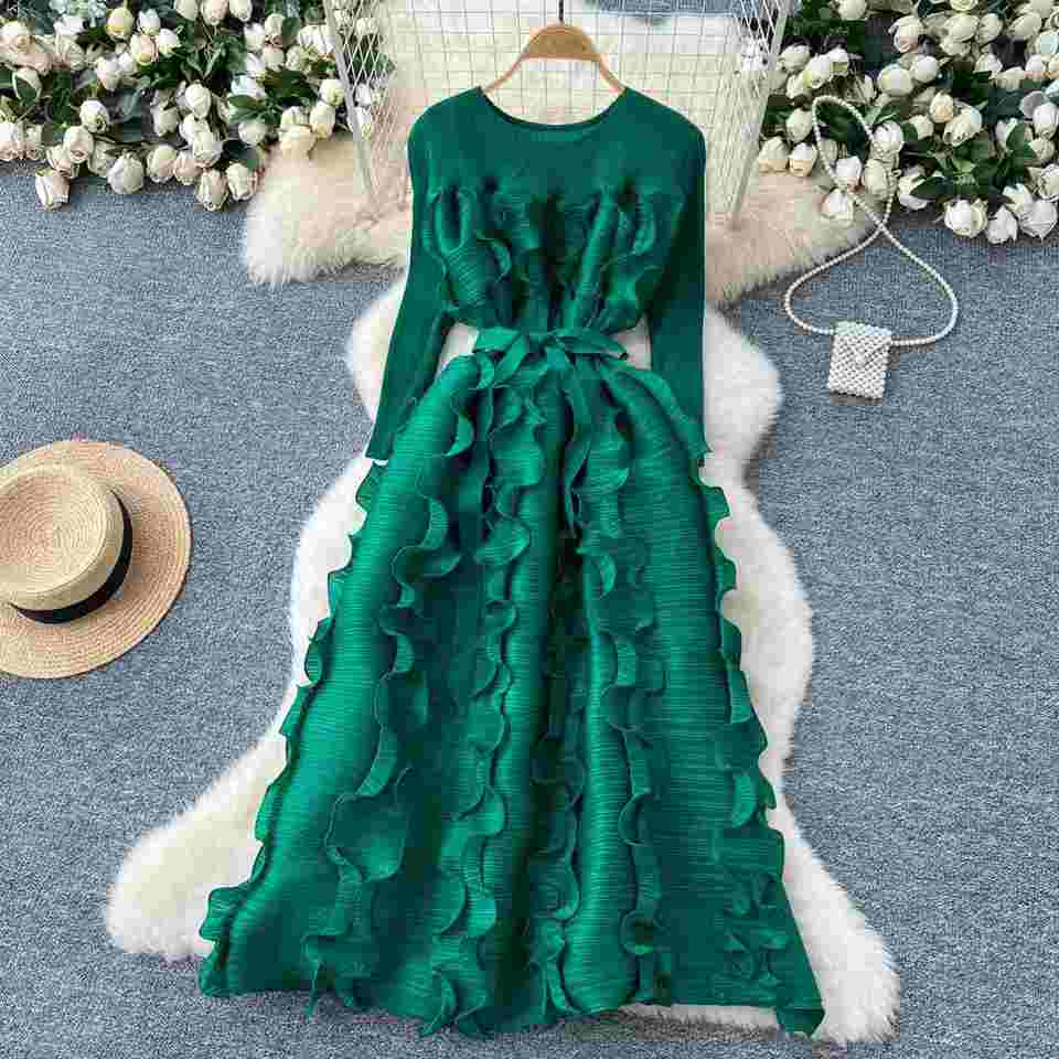 Robe midi plissée élégante à col rond et bandage pour femme, style Empire, avec dentelle 3D, collection Printemps