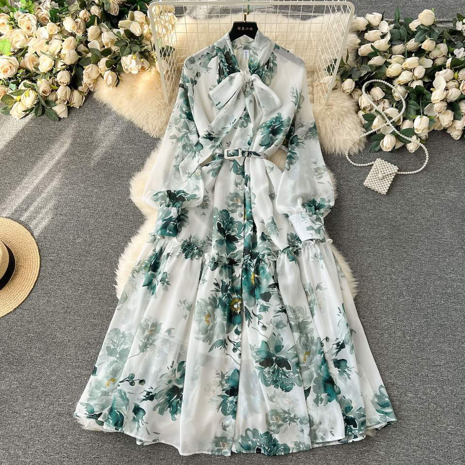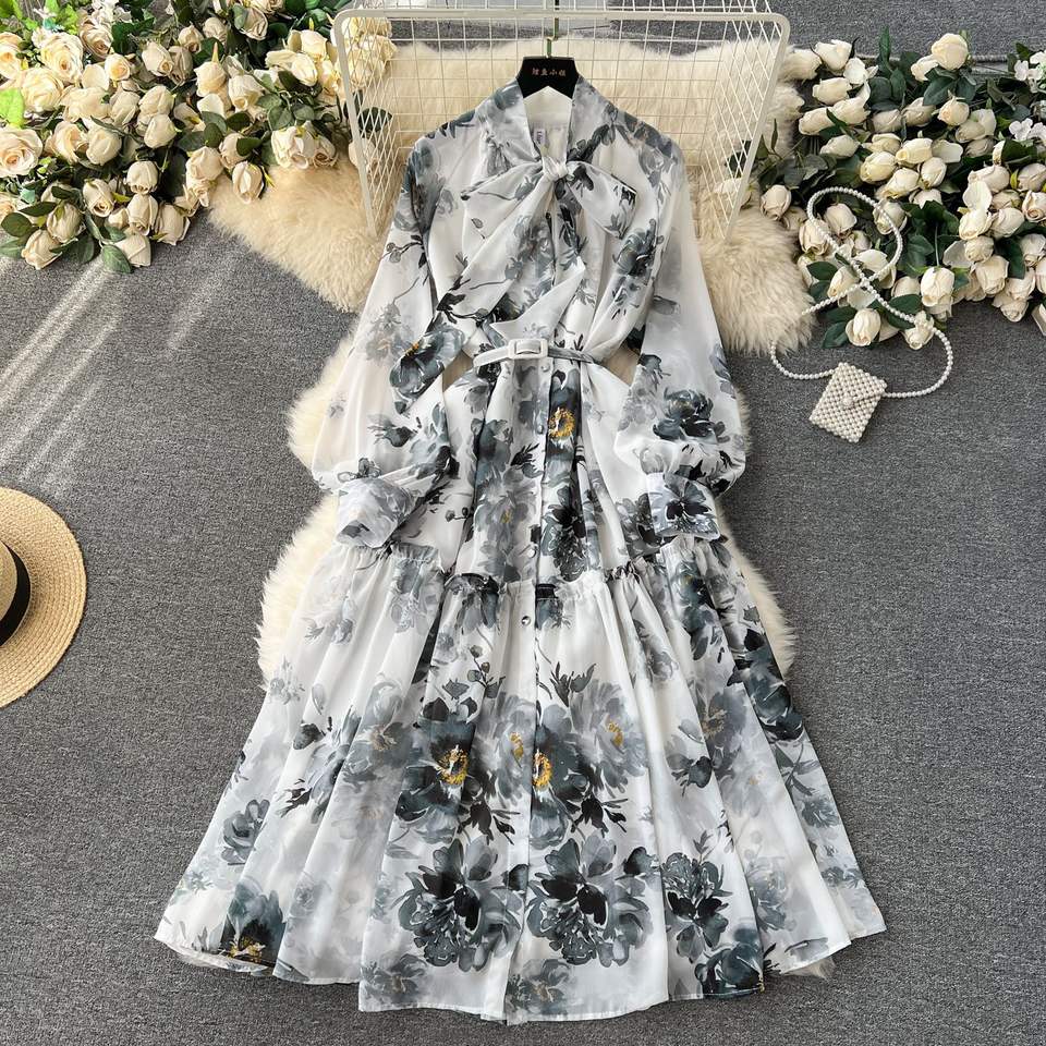 Printemps nouveau Style français élégant col papillon taille serrée minceur mi-longueur rétro imprimé élégant robe imprimé fleur robe florale