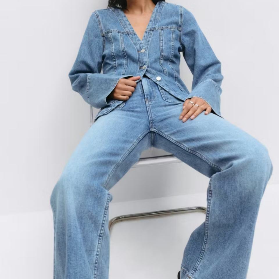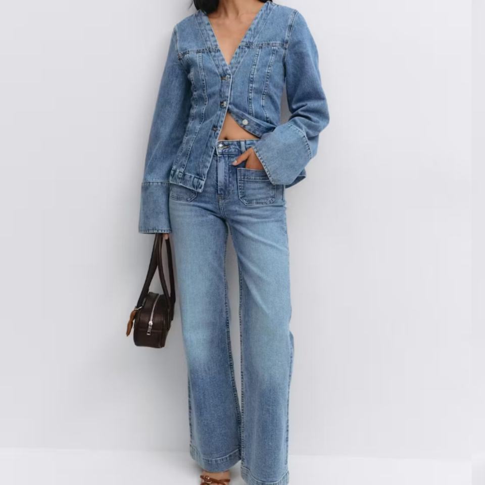 Nouvel ensemble en jean pour femme printemps - Veste en jean décontractée à col en V et jean taille haute coupe droite 100 % coton, effet délavé vintage