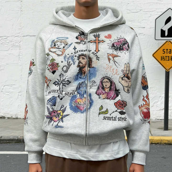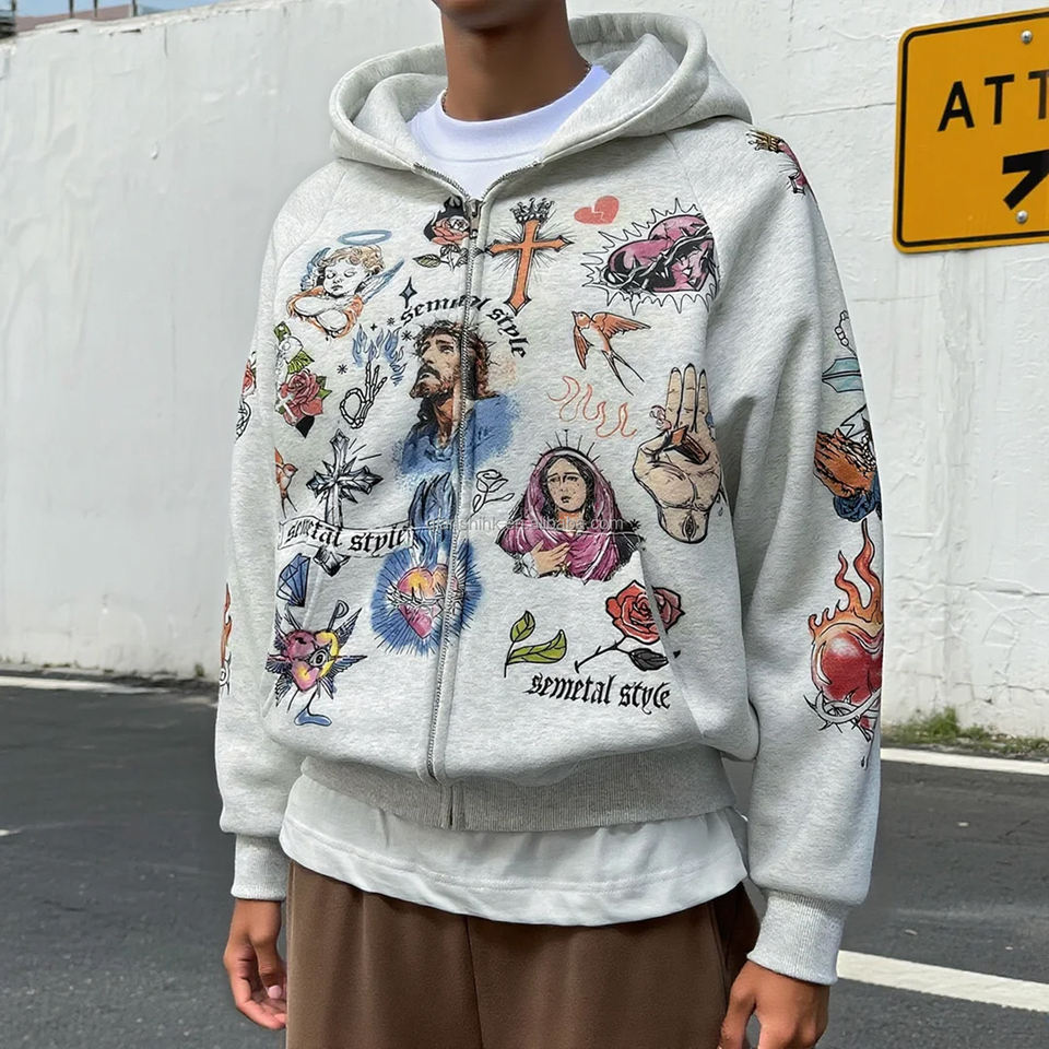 Printemps Streetwear Hommes Imprimé Graphique Surdimensionné Fermeture Éclair Hoodies Personnalisé Coton Poids Lourd Hommes Zip Up Hoodie Fabricants