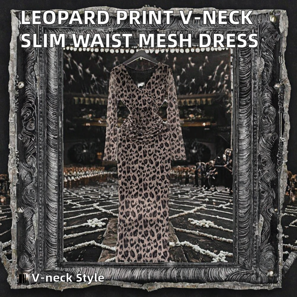Robe mi-longue sexy vintage à manches longues, col en V, taille empire, imprimé léopard, tissée, respirante et écologique, pour printemps, été, automne