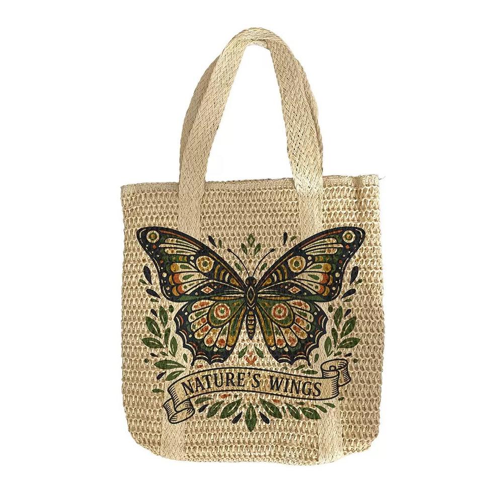 Sac fourre-tout en paille tressée à la main printemps-été avec imprimé floral et papillon, sac à main décontracté pour les vacances pour femmes et filles